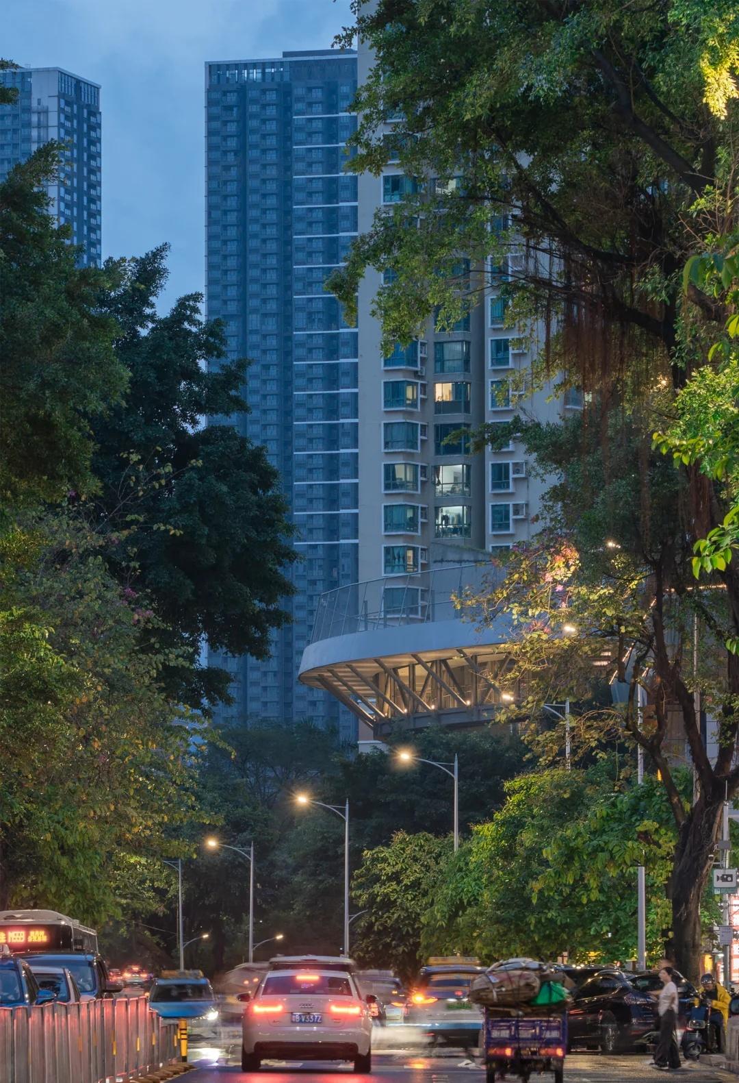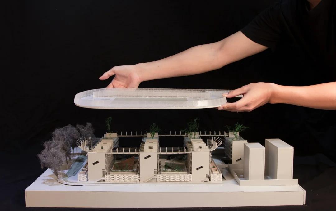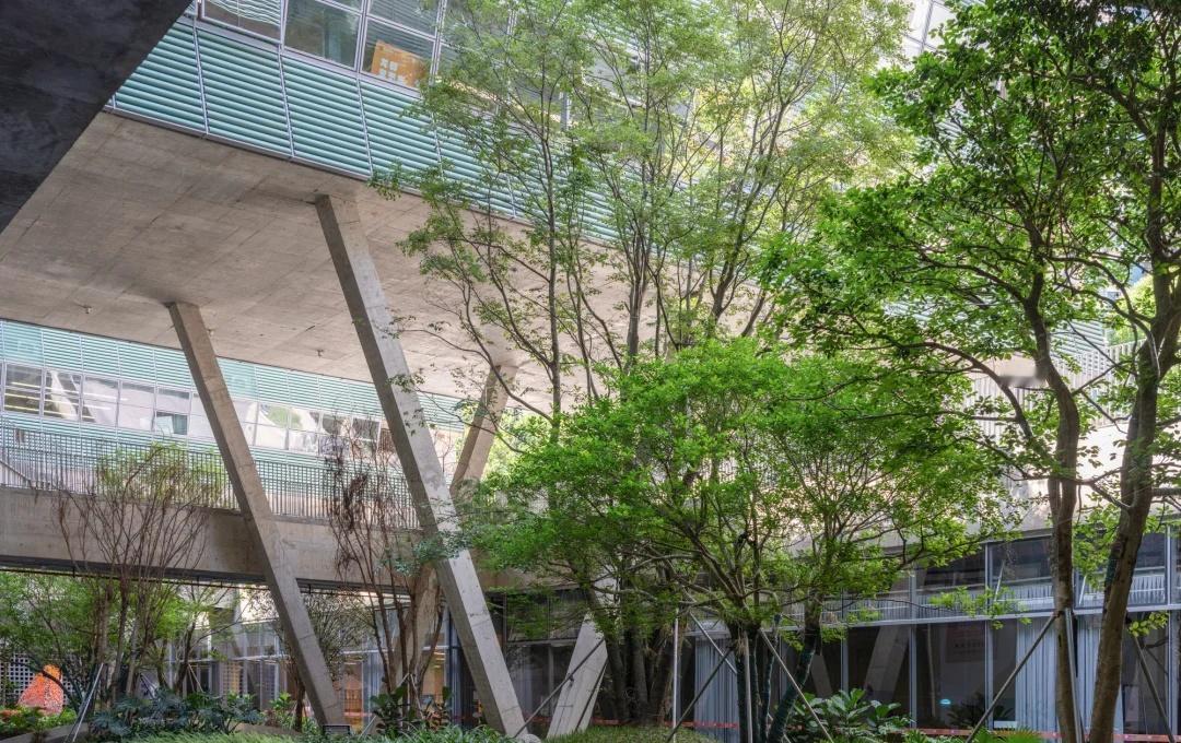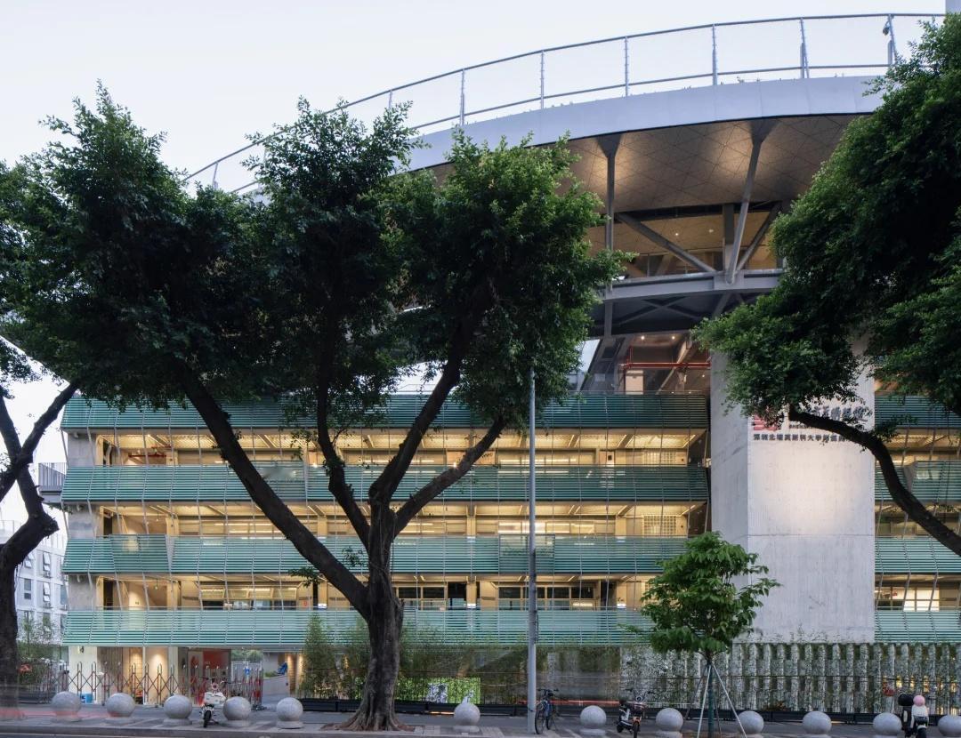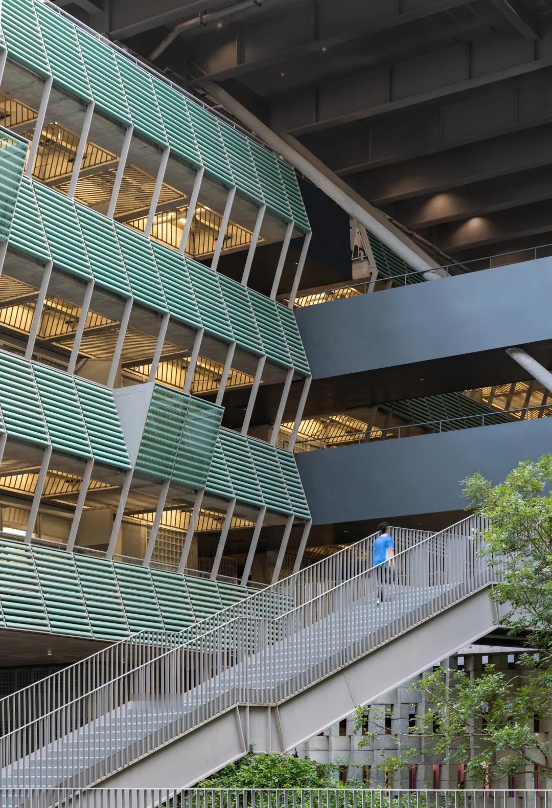 绿野仙踪——深圳美术学校 我们在红岭实验小学和红岭中学新艺体中心两个位于福田新建城区的项目试图引入人文地理学的视角,发起对深圳城市唯效率论空间范式的反思和挑战。这两所校园设计中在某种程度上恢复珠三角传统的人、地、景、筑一体的地方景物传统,从而实现校园作为养育人文精神之所的场所重建。而到了罗湖旧区,曾经高速兴建的标准化城区经历数十年的演变后如今也装载了相对稳定街道和社区生活,加上植被多年的生长,它们的尺度相对其他新开发的城区显得宜居和迷人。这点也让我们觉得新建校园在街道层面也应对此给予尊重及善意回应。 校园用地异常紧张,任务书的容积率高达 3.0。校园的强排方案均只能放下小于 200 米环形跑道,且剩余空间对于 24 班高中的教学和居住用房而言变得异常紧张。为了应对场地的高密度挑战,我们将传统教学用房与体育场地水平并置的模式转换成垂直叠加的方式。 一片拥有接近 300 米环形跑道和 115 米直跑道外加真草球场的体育地盘被悬置于 5 层教学用房之上,为整个校园提供了一个巨大的遮荫空间,且以此在地理学层面回应北侧绿树成荫的围岭公园所带来的城市公共绿化向校园延伸的未来可能。教学和宿舍用房放松而理性地融入现有城市肌理,与纵向的矩形下沉庭院共同构成一组宜人的立体校园院落。 深圳美术学校 / 源计划建筑师事务所 图源:ArchiDAily
