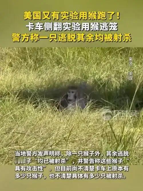 美国实验用猴逃跑事件简直成了一部“连续剧”。当地时间10月28日,密西西比州一辆运输猴子的卡车发生侧翻,一群恒河猴趁机逃窜。最终,除一只猴子外,其余均被射杀。然而,卡车原本装载猴子的数量以及具体射杀的数量都尚不明确。此外,关于这些猴子是否携带病毒,各方说法不一。警方最初称猴子携带疱疹等疾病,杜兰大学却表示它们并无传染性。 这并非美国实验猴首次出逃。2024年11月6日,南卡罗来纳州耶马西镇的43只雌性恒河猴,因新员工未关好围栏而逃脱,直至两个多月后才全部被捉回。涉事机构此前也曾多次发生动物逃跑事件,2014年、2016年都有此类情况出现,2018年还因动物逃离和待遇问题受到联邦监管。美国在实验猴管理方面实在是太不靠谱了。 恒河实验猴 美国猴 美国动物实验