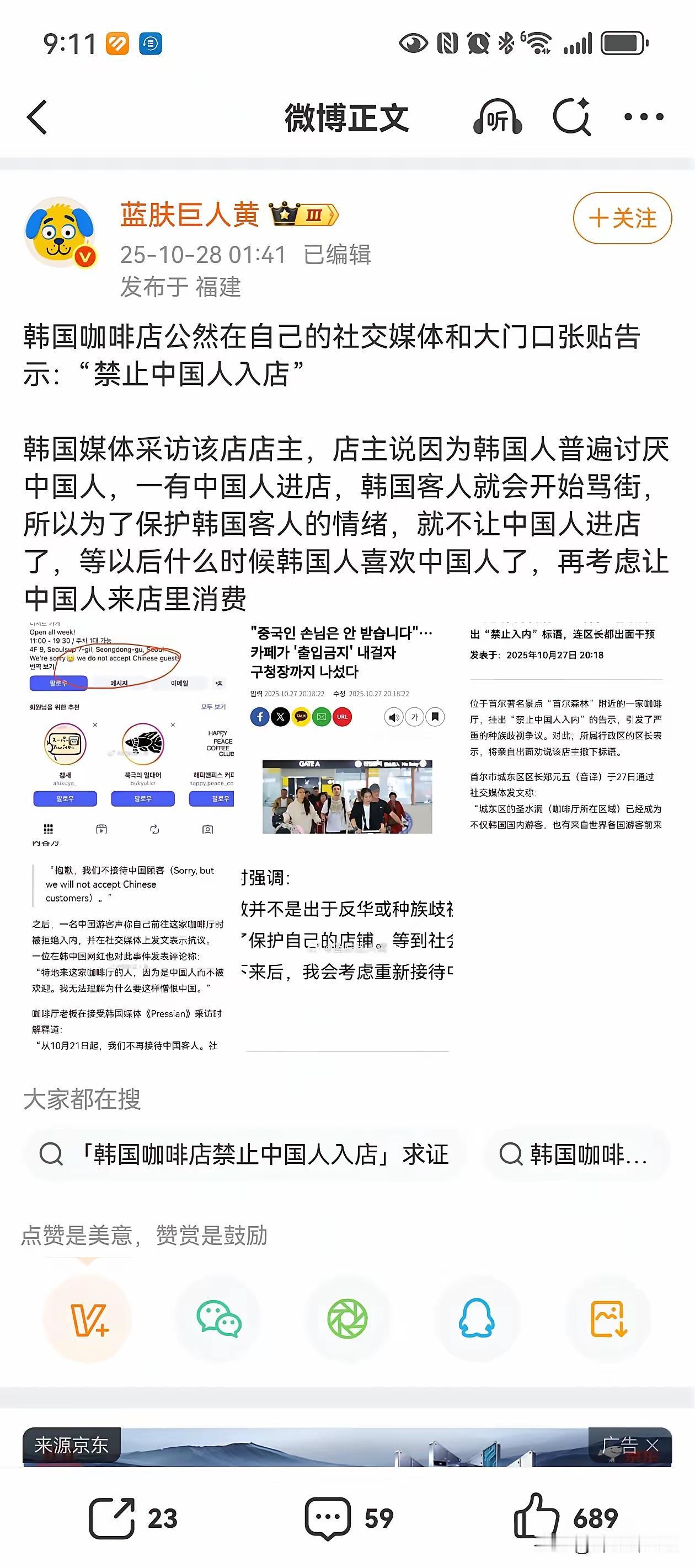 这两天韩国热搜被一家咖啡馆引爆,店家悍然贴出禁止中国人入内的告示,引发全网热议。 馆主给出的理由荒唐又伤人,声称个人不反华,但韩国人普遍反感中国人,中国人进店就会遭韩国顾客叫骂。 事件发生在首尔城东区,随着在韩中国网红曝光视频,10月27日起迅速冲上韩国热搜,当地媒体纷纷跟进报道。 在韩中国网红看到告示后怒不可遏,直言2025年居然还存在这种赤裸裸的歧视,强烈谴责店家的无理行为。 面对舆论风暴,首尔城东区厅长郑元10月27日回应,称已关注到该事件,将尽力与店家沟通说服。 但这种“尽力说服”的表态引发质疑,不少人认为对歧视行为不应仅靠沟通,更需明确的约束与纠正。 馆主所谓“韩国人普遍反感中国人”的说法,根本站不住脚。中韩民间交往中,友好互助的案例比比皆是。 近年中国游客为韩国旅游业带来大量收入,许多韩国商家曾主动推出中文服务、中式菜品迎合需求。 类似的歧视事件并非首次,此前曾有韩国餐馆限制中国游客用餐时间、商铺拒绝中文咨询等情况。 但这些都是个别现象,不能代表全体韩国民众,馆主将个人歧视包装成“普遍民风”,实则是在制造对立。 网友对此争论激烈,有人表示不会再去这家店消费,也有人呼吁理性看待,不要因个别事件否定全部。 还有网友吐槽,部分韩粉盲目追捧韩国文化,却忽视自身尊严,面对歧视行为更应坚守底线。 从法律层面看,韩国虽无专门针对消费歧视的严苛法律,但这种区别对待已违背公平交易的基本准则。 事件持续发酵后,不少在韩华人组织发声,要求店家道歉撤下告示,维护在韩中国人的合法权益。 客观来看,个别商家的歧视行为,既伤害了中韩民间感情,也会影响韩国的旅游形象与经济收益。 中国游客外出旅游是为了放松身心、增进交流,而非忍受歧视,尊重是相互的,没有尊重便无往来。 从后续走向看,若店家坚持不整改,可能会面临更多华人的抵制,甚至影响周边商家的经营。 首尔市政府若仅停留在“说服”层面,难以平息争议,或许需要出台更明确的规范,杜绝类似歧视。 中韩民间友好的基础是相互尊重,个别不良商家的行为,不应成为破坏两国人民情谊的导火索。 但对于歧视行为,我们必须零容忍,既要理性维权,也要让对方明白,尊重是获得认可的前提。 希望店家能正视问题、主动道歉,也希望更多韩国民众看清真相,共同抵制歧视,维护两国交往的良好氛围。 文章描述过程、图片都来源于网络,涉及版权或者人物侵权问题,或有事件存疑部分,联系后即刻删除或作出更改。