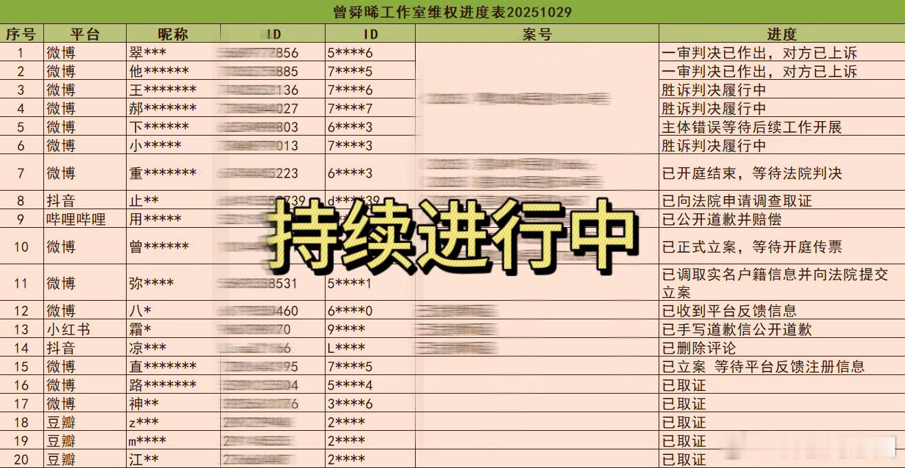 曾舜晞 方更新维权进度表!!全平台告嘿中,不接受任何形式的调解与和解!支持曾舜晞