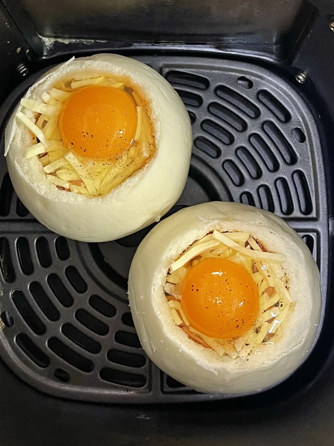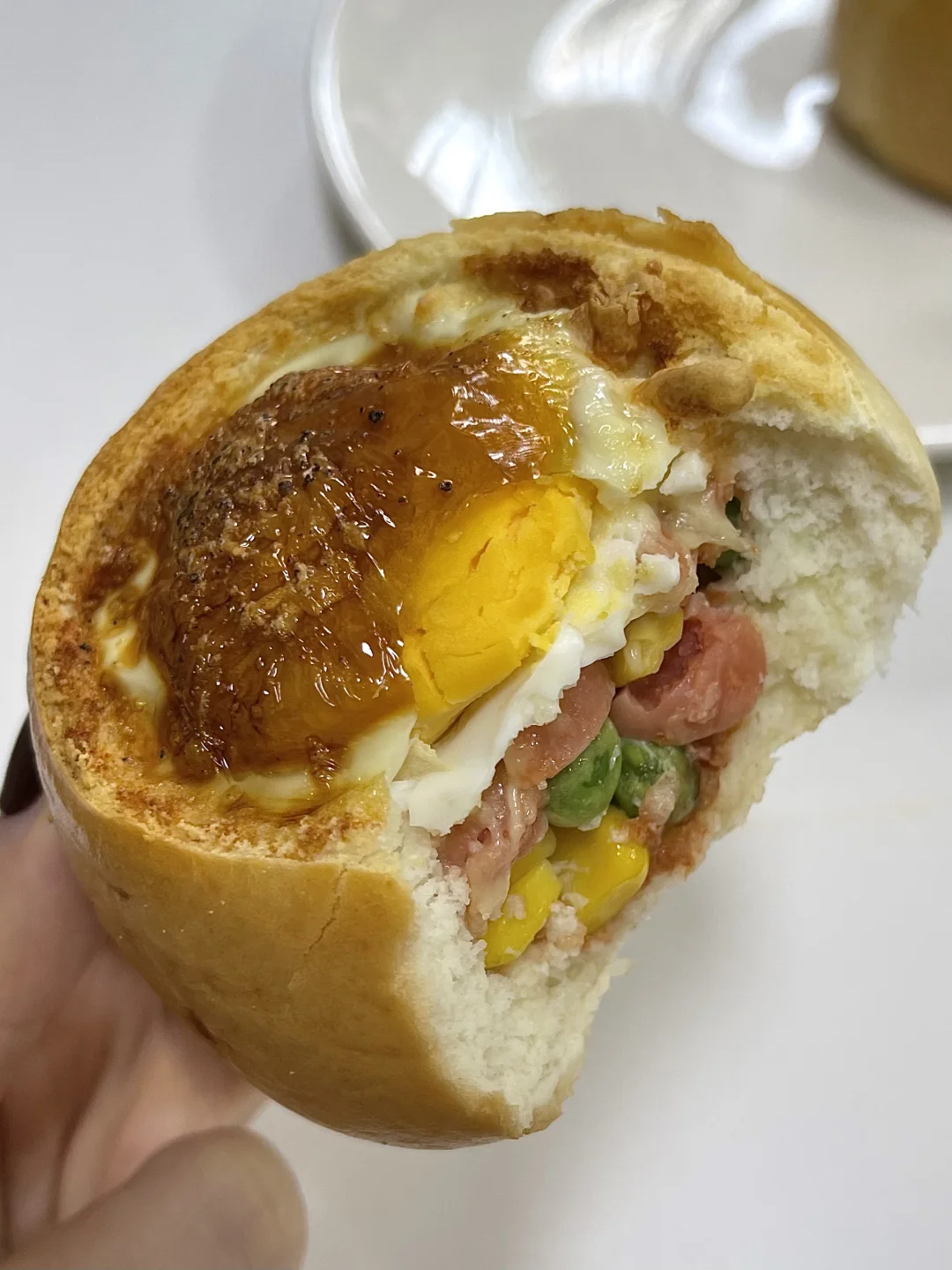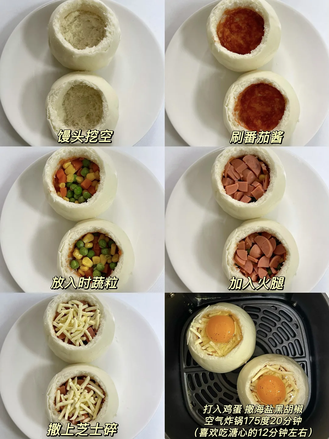 中国人有自己的汉堡! 馒头鸡蛋堡!!(前几天的升级版hhhh) 馒头烤的超酥脆! 嫩嫩的鸡蛋 一口下去口感巨丰富 还拉丝…巨巨巨好吃! 食材:馒头 鸡蛋 时蔬粒 火腿 芝士碎 步骤如图⬆️赶紧去试试!