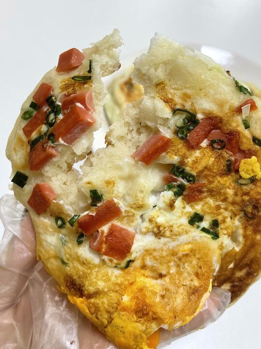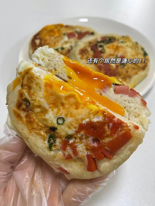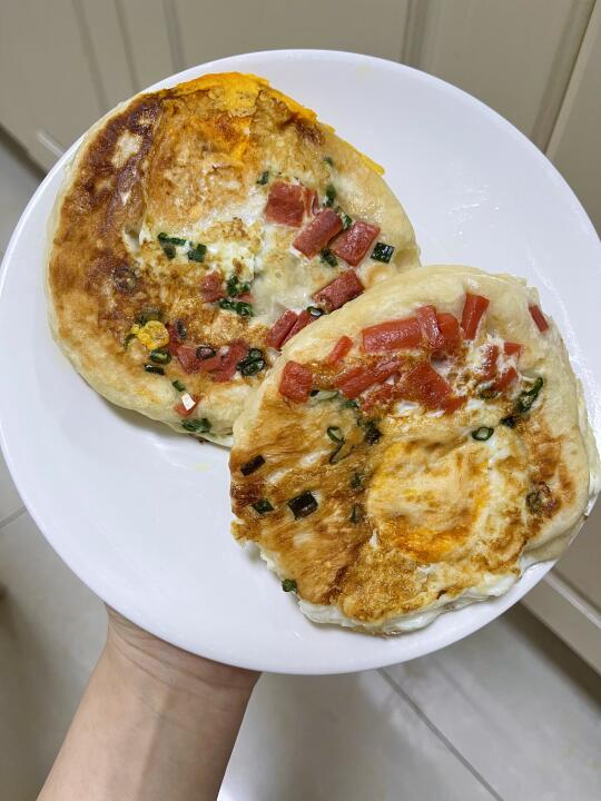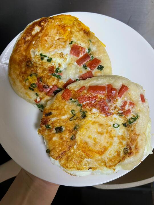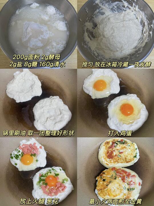 喧软劲道的鸡蛋发面饼太香了! 还加了火腿跟葱花 真的不输早餐店的味道 免揉面!!早上10分钟就可以搞定 方便好吃有营养 赶紧去做呀 食材:鸡蛋 面粉 火腿 葱花 酵母