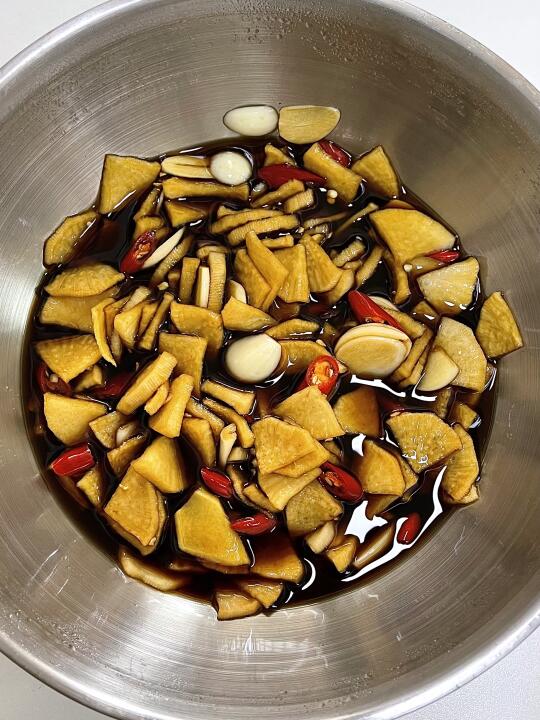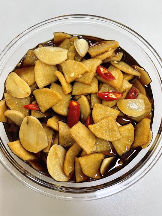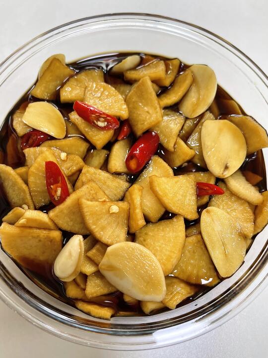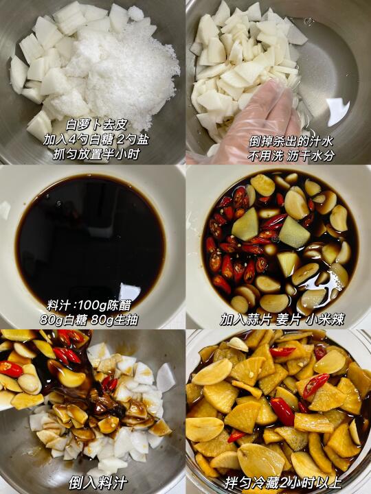 酸辣脆爽的泡萝卜! 夏天吃这个太开胃啦 清爽又解腻 贼下饭!!吃粥啥的也很合适 料汁:100g陈醋 80g生抽 80g白糖 加入蒜片 小米辣 姜片 做法: 一颗白萝卜洗净去皮 切成片状 加4勺白糖2勺盐抓匀 放置半小时杀出水分 倒掉汁水 攥干水分 倒入料汁放入冰箱泡2小时以上就ok啦