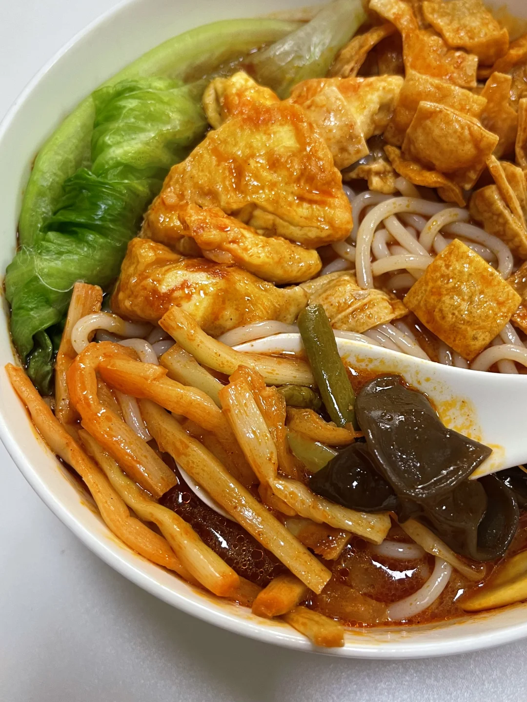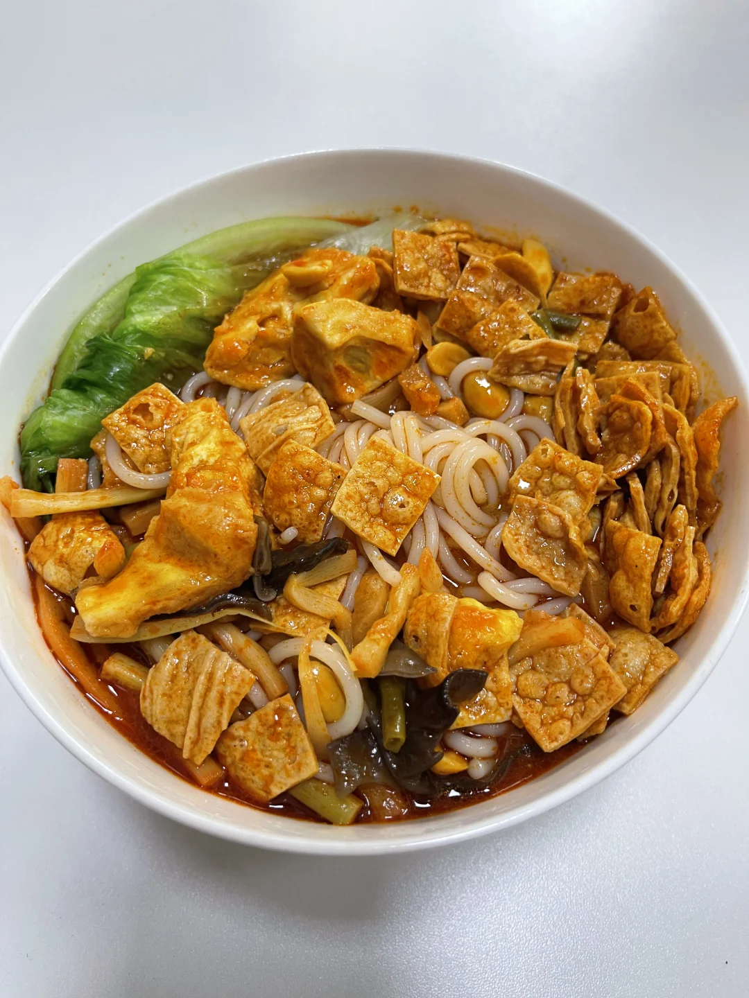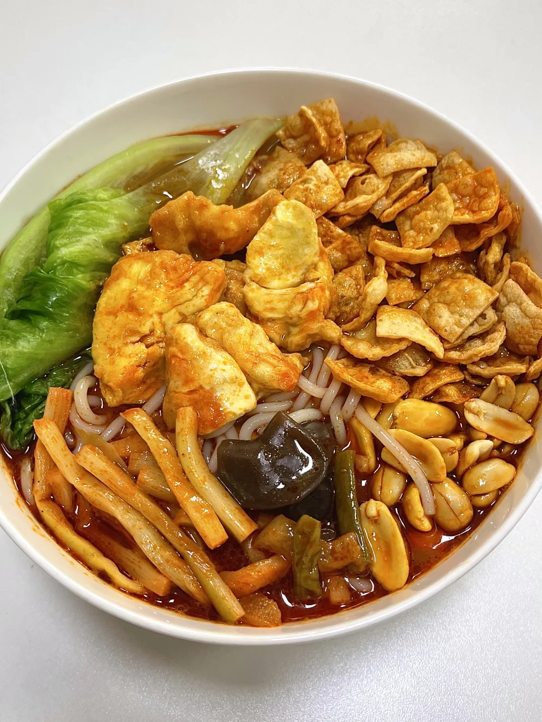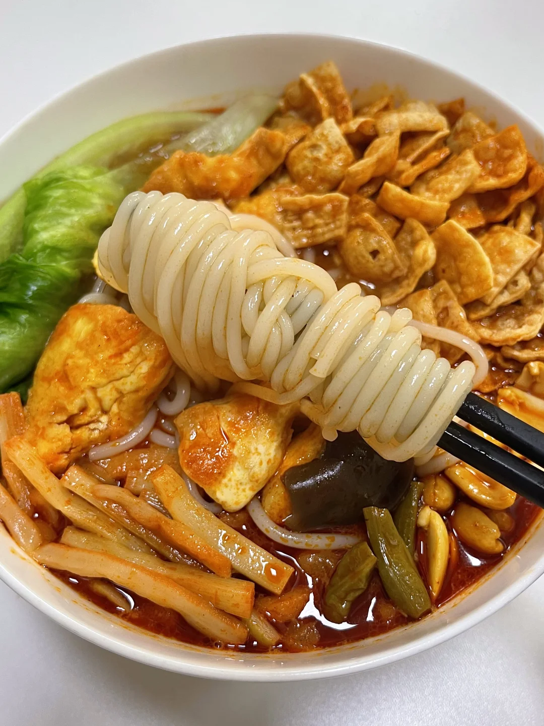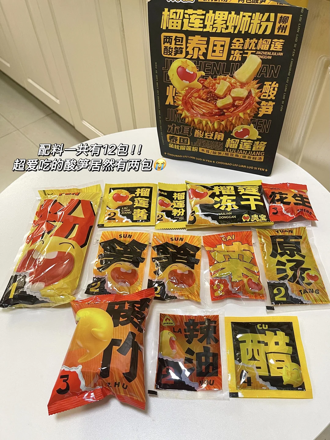 料是真的多!吃的时候感觉在配料里找粉hhh…足足12包配料!!每袋配菜都是大块的!饱满的金枕榴莲肉,看得见的真榴莲,干吃酥酥的,吸饱汤汁又是糯糯的!劲道的米粉入口爽滑,花生米香脆,酸笋脆嫩,腐竹吸满了浓郁的汤汁超入味!口感巨巨巨丰富!!