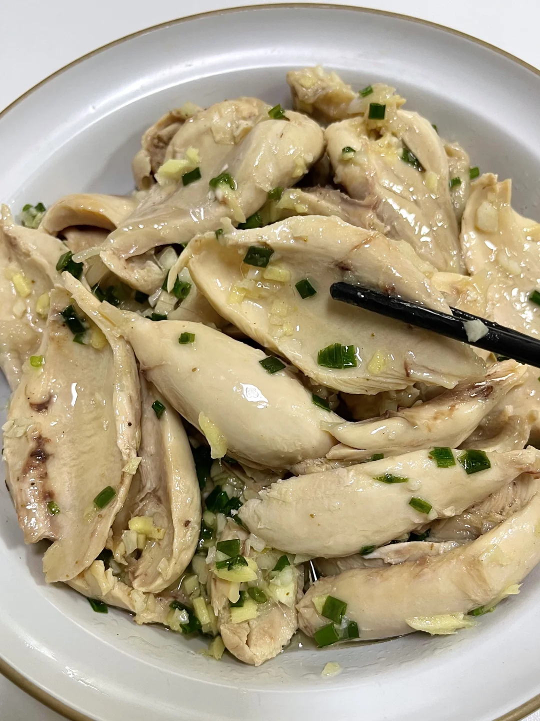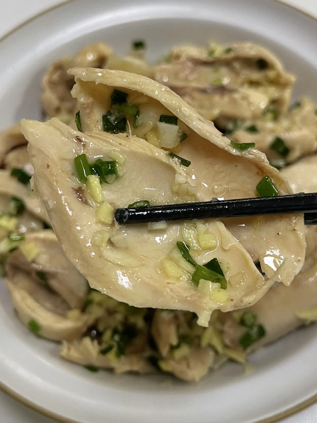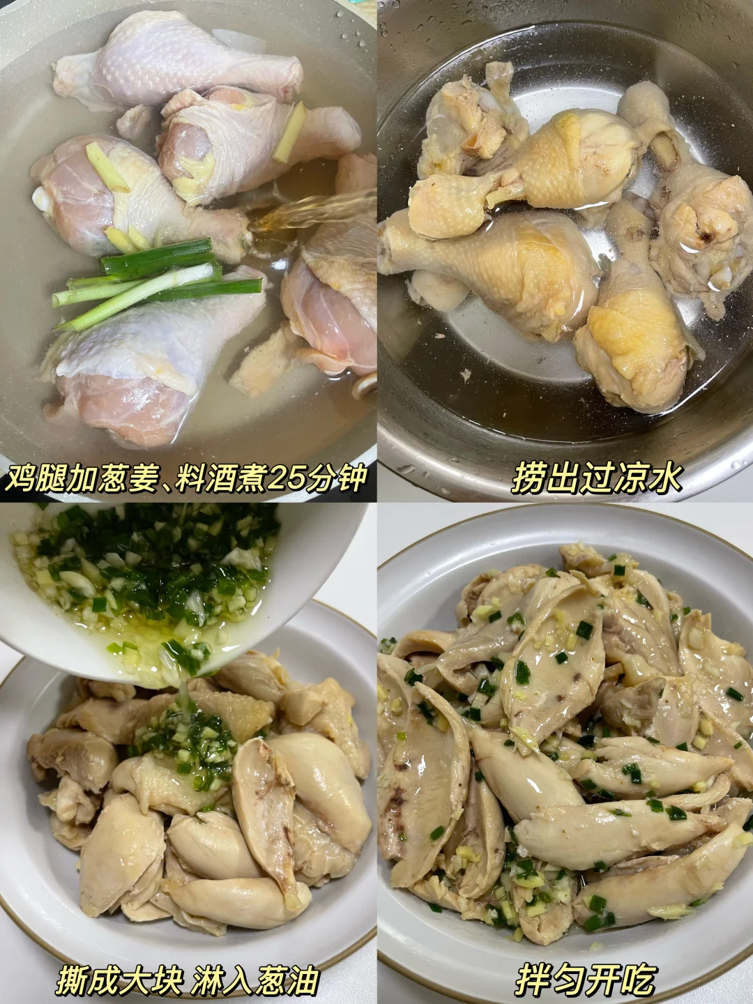 这个葱油鸡腿真的太太太香啦!! 超嫩滑~香香嫩嫩的 一口下去淡淡的葱香味~ 连吃几个都不腻!! - 准备一碗葱油汁: 碗里切好葱姜末,泼入热油 加入一勺椒盐粉 半勺盐、糖搅匀 鸡腿加葱姜、料酒煮25分钟 捞出用凉水浸泡五分钟 撕成大块 葱油汁倒入鸡腿肉中即可