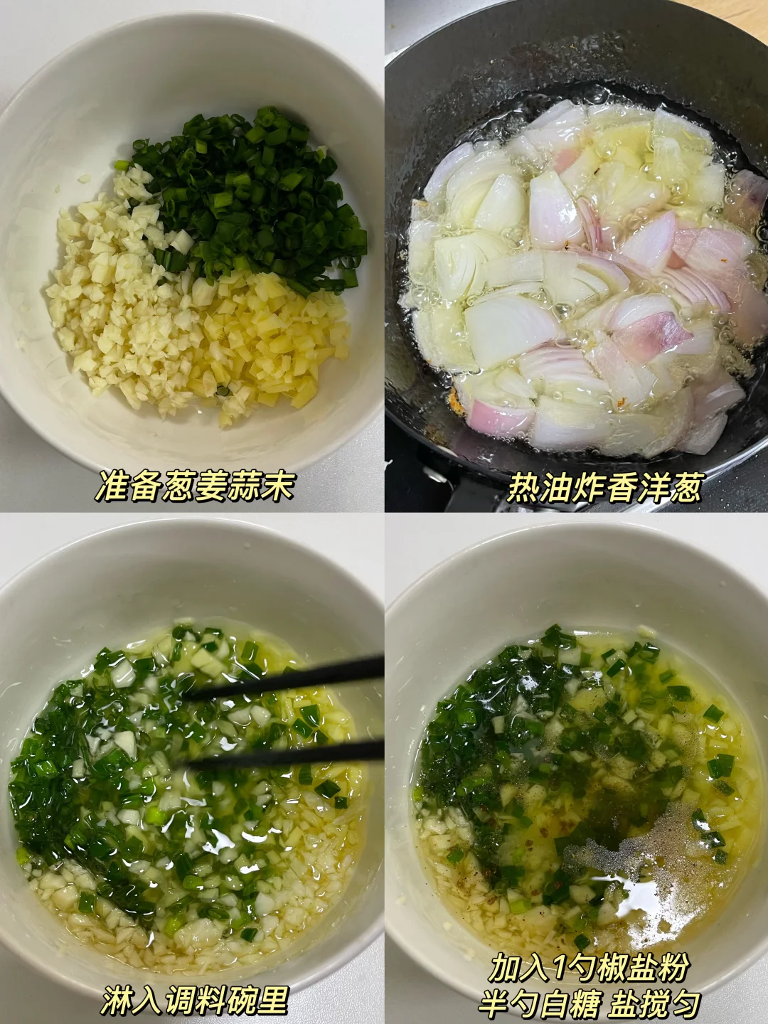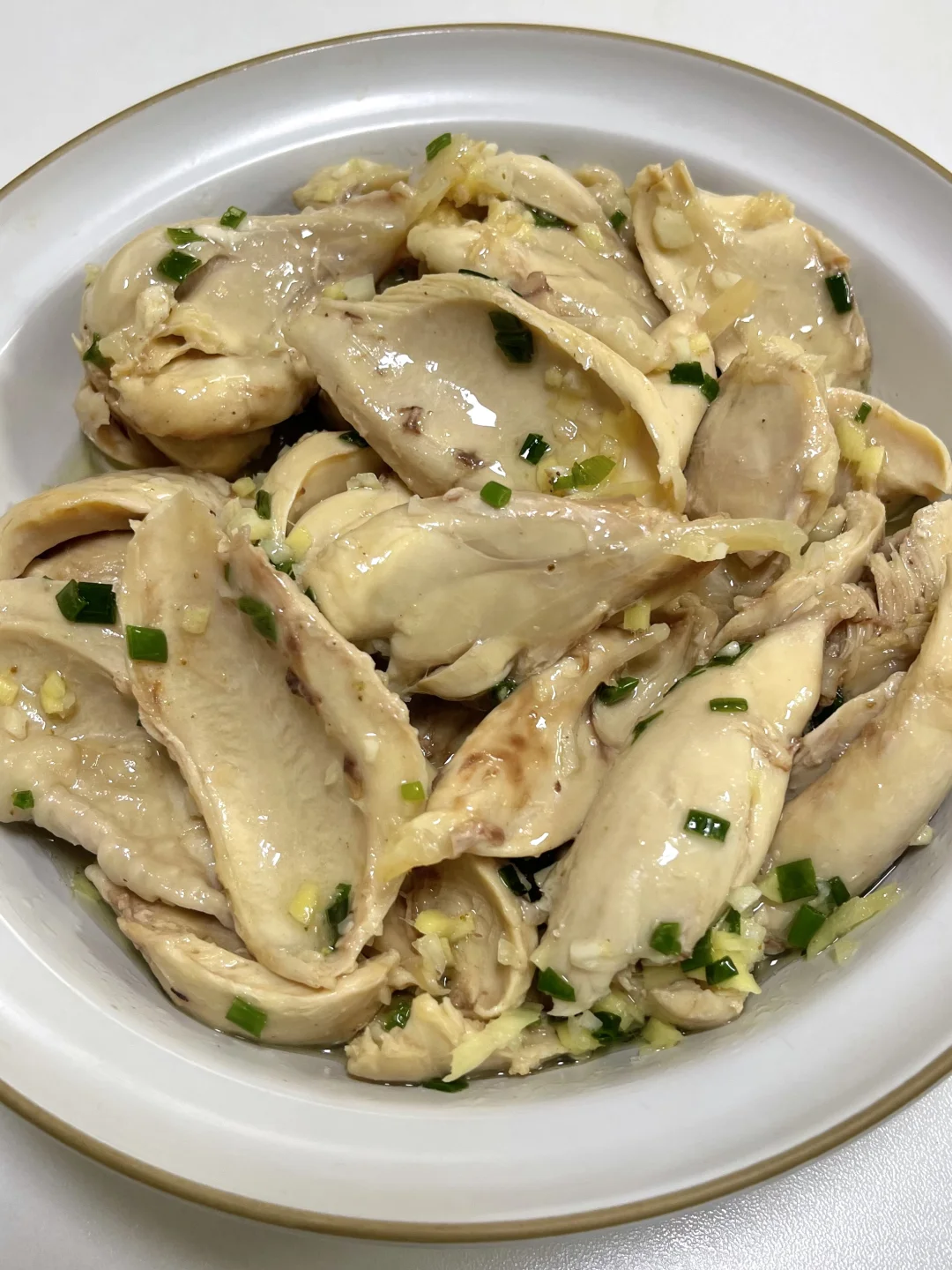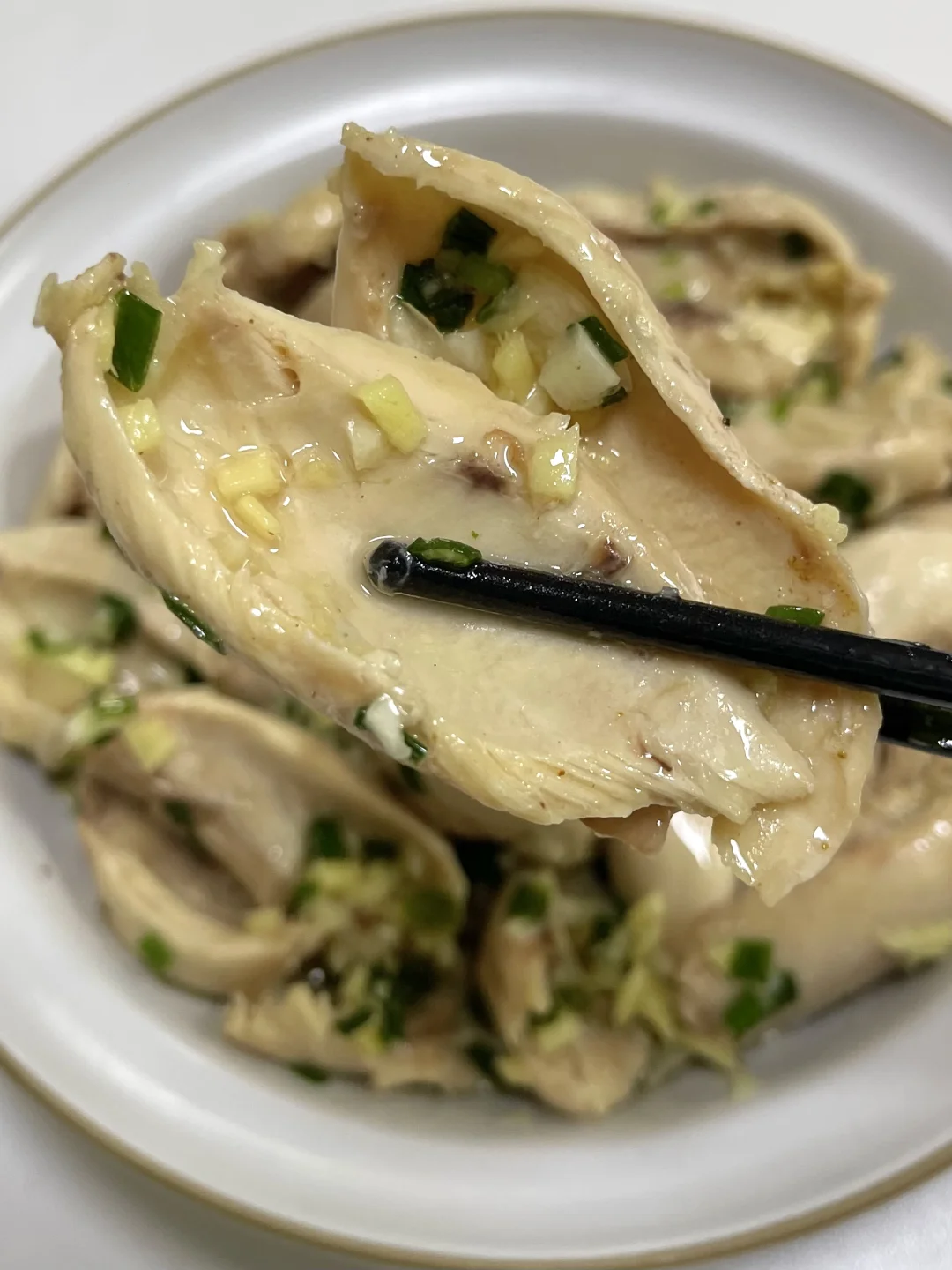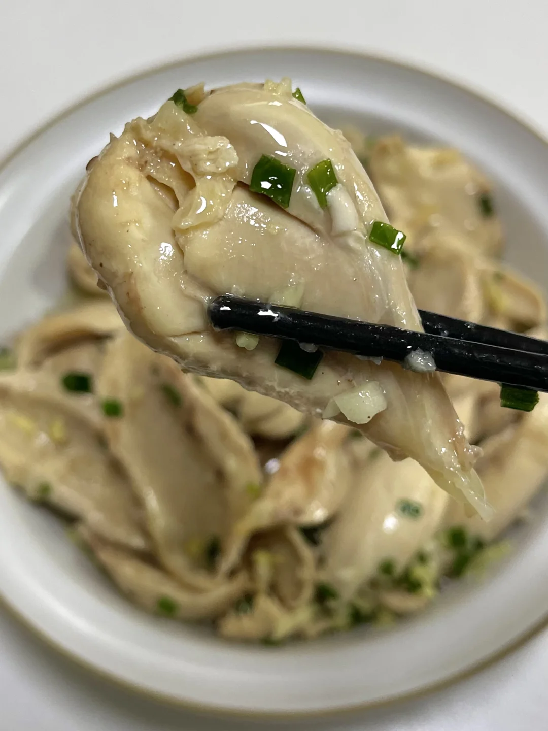这个葱油鸡腿真的太太太香啦!! 超嫩滑~香香嫩嫩的 一口下去淡淡的葱香味~ 连吃几个都不腻!! - 准备一碗葱油汁: 碗里切好葱姜末,泼入热油 加入一勺椒盐粉 半勺盐、糖搅匀 鸡腿加葱姜、料酒煮25分钟 捞出用凉水浸泡五分钟 撕成大块 葱油汁倒入鸡腿肉中即可