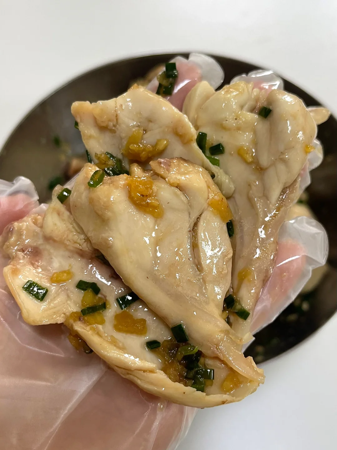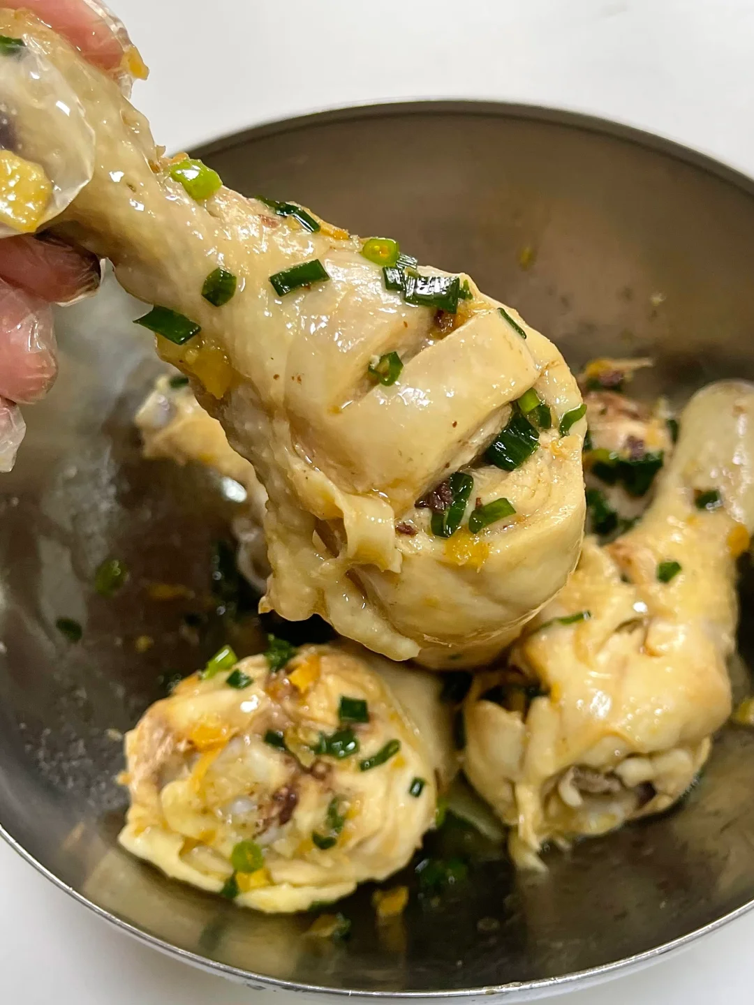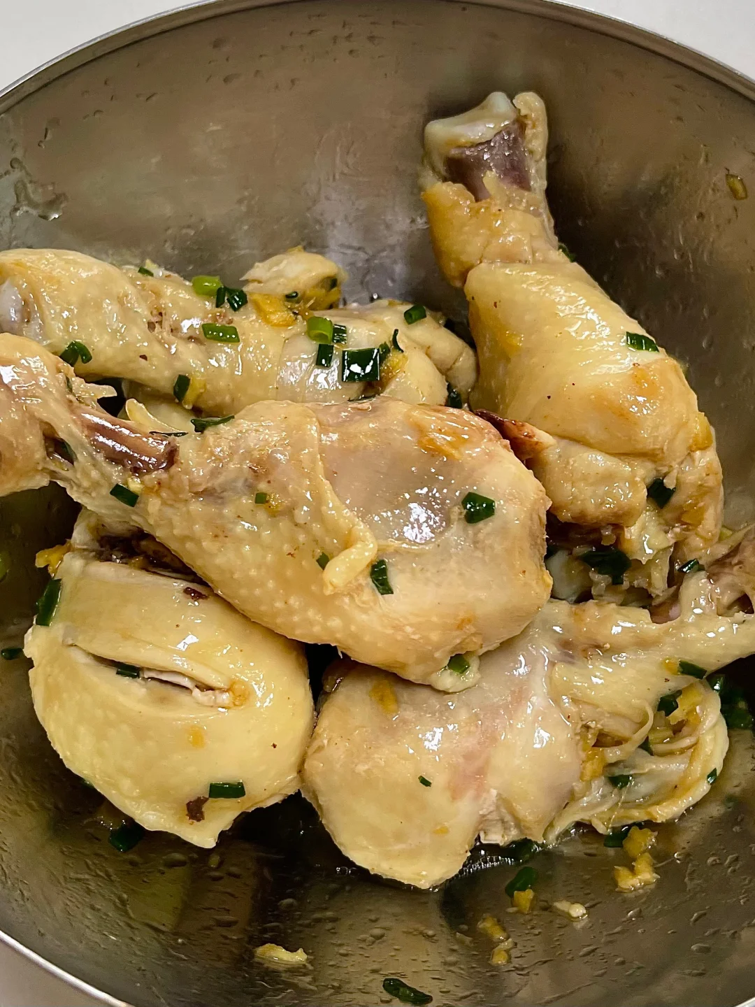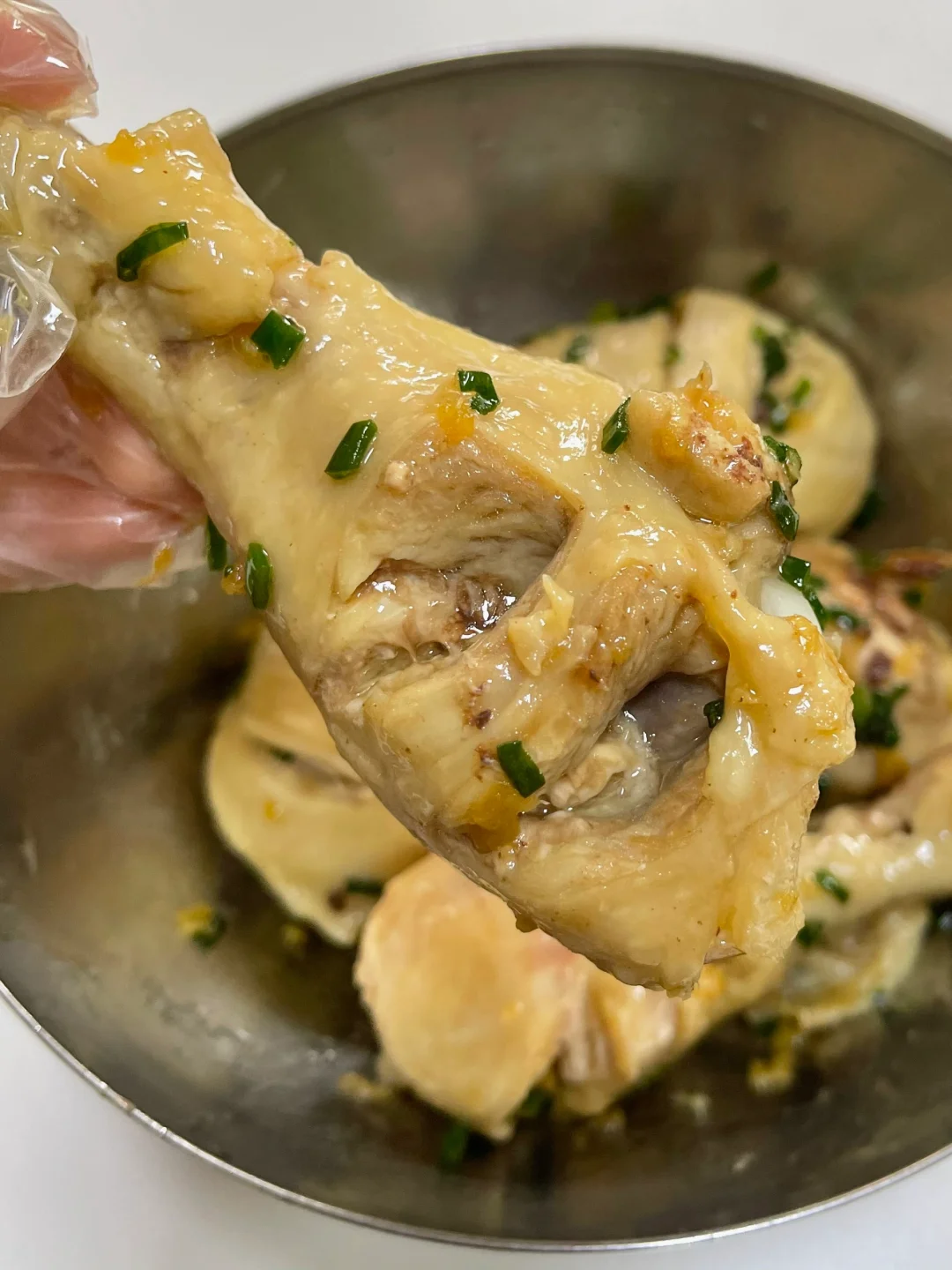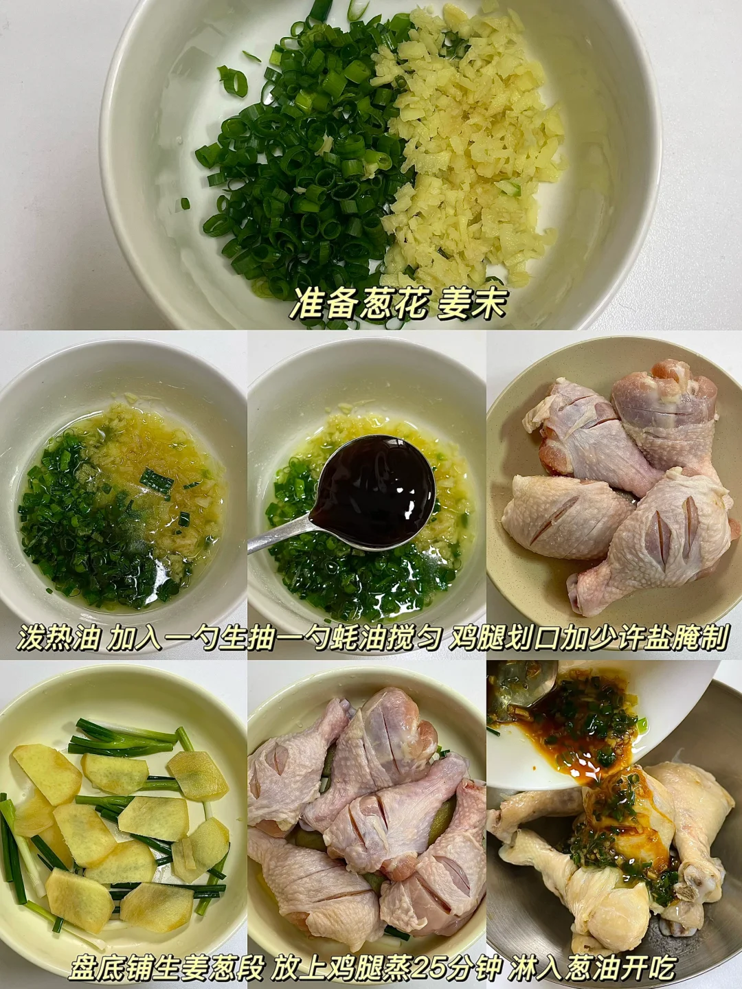 真的太太太香啦!! 超嫩滑~香香嫩嫩的 一口下去淡淡的葱香味 连吃几个都不腻!! 鸡腿这么做真的好绝!! - 葱油汁: 碗里切好葱姜末,泼入热油 加入一勺生抽、一勺蚝油搅匀 碗里铺葱姜 放上鸡腿蒸25分钟 葱油汁倒入鸡腿肉中开吃 加点白芝麻更香!!