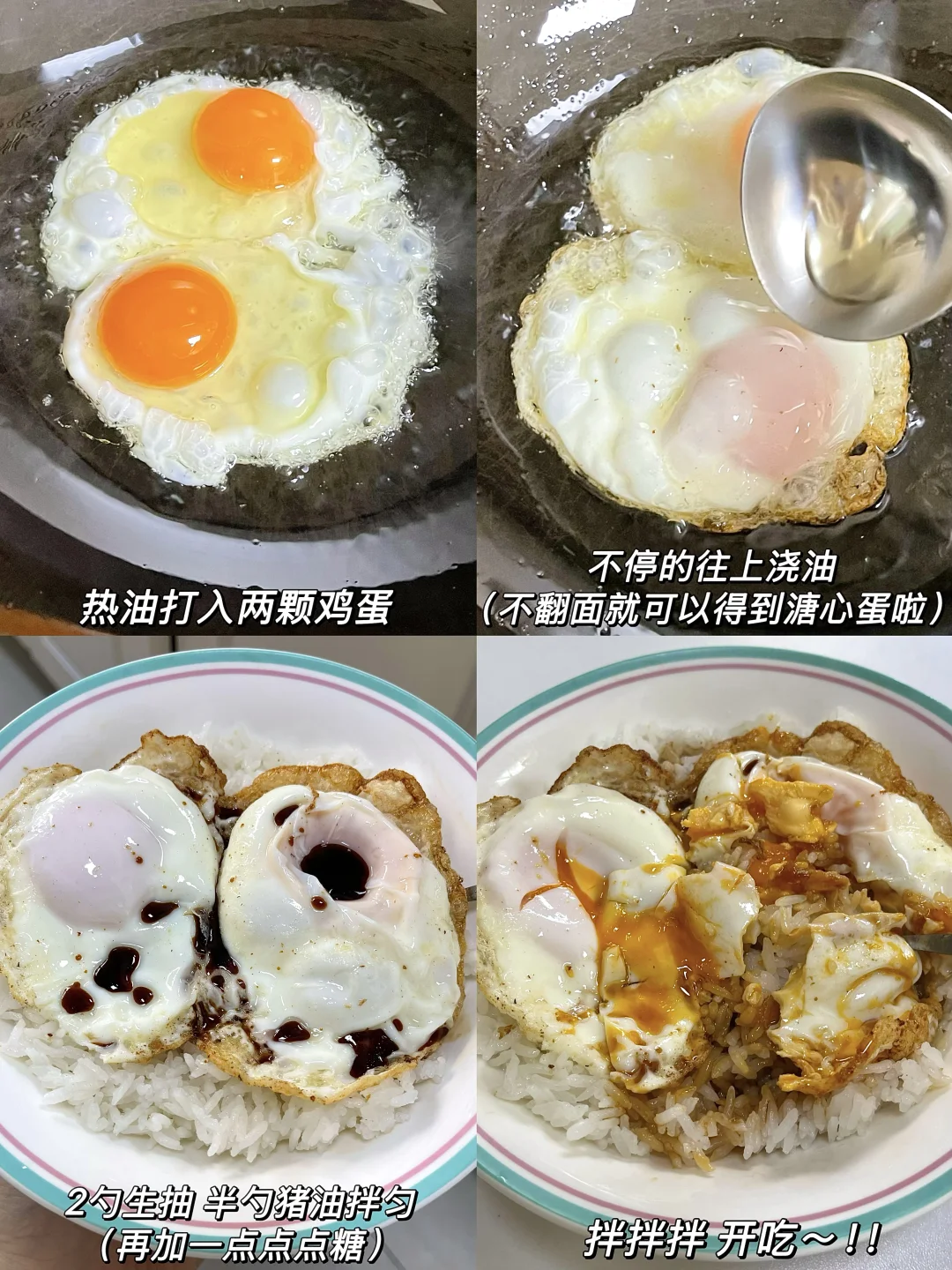 溏心蛋拌饭!自己在家就可以做! 好多次去烤肉店就为了这一口😭 用猪油煎蛋巨香!! 油热打入鸡蛋 用铲子往上浇油 溏心状态就ok 然后加一勺生抽、半勺香油拌着热米饭开吃~ 每一粒米饭上都包裹着酱汁 啊啊啊真的好绝! 求你们赶紧去试试!!