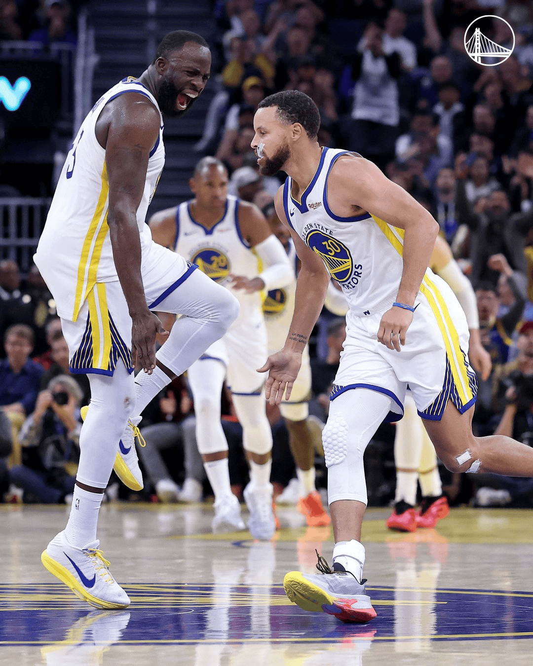 赛后,勇士官方更新社媒分享库里和德雷蒙德-格林的庆祝照。