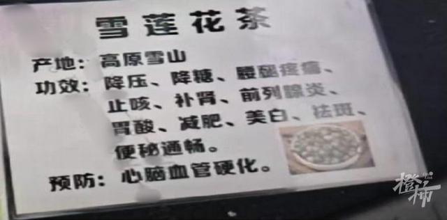 喊话的商贩戴着一顶民族风格的帽子,摊位前立着块“雪莲花茶”的招牌,“降压、降糖”“(治)腰腿疼痛”等功效格外显眼。