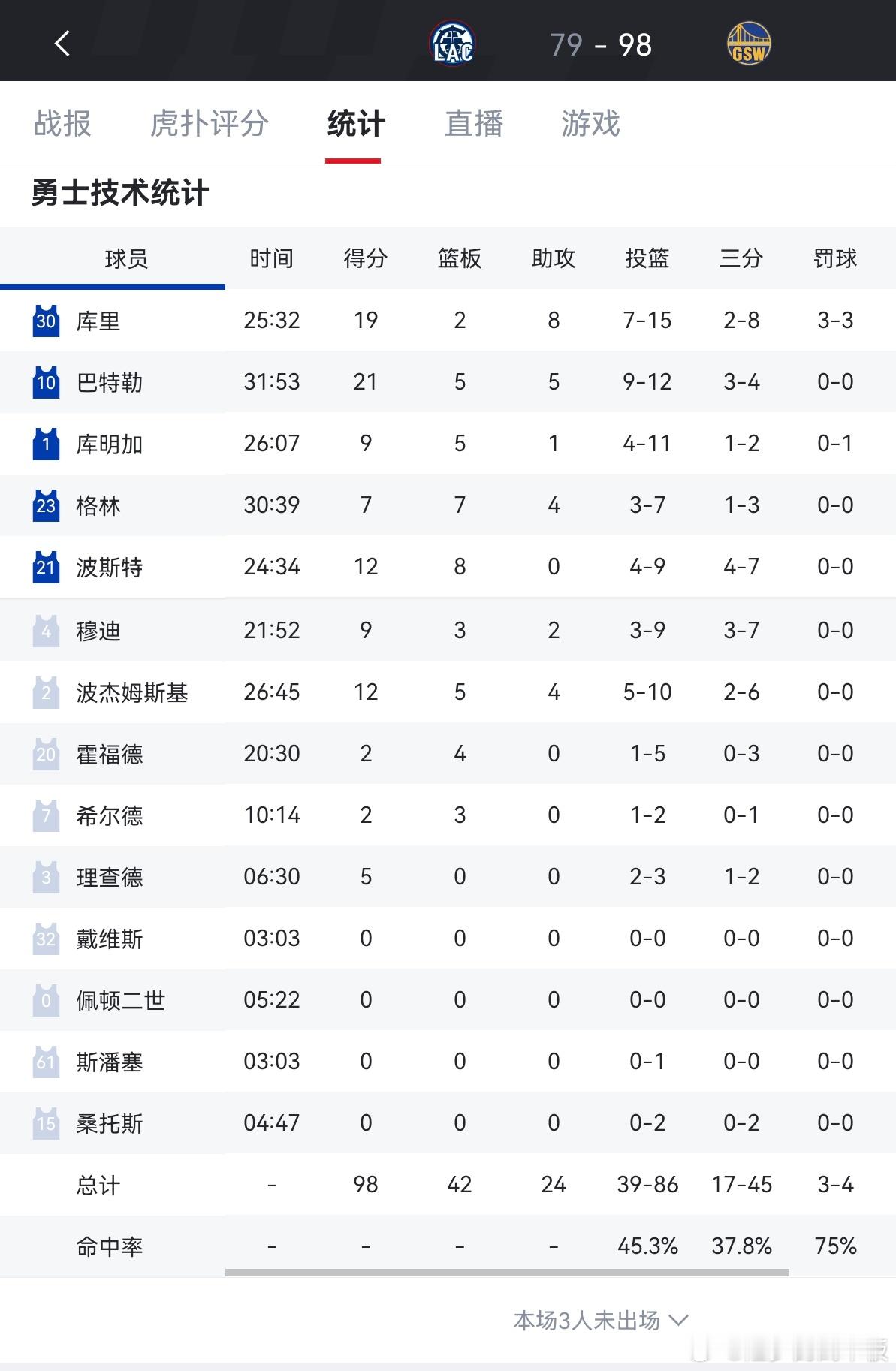 勇士98-79轻取快船,开局4胜1负排西部第三库里19分,巴特勒21分,快船全队