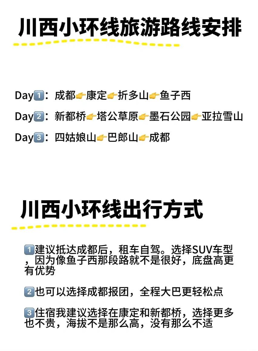 这次走的是川西小环线,三天2夜就够了!行程都给你们整理好了,记得先看看哦!不绕路,自我感觉不匆忙,刚刚好蛮悠闲! 如果你们7、8月有计划来!可以收藏一下,可以作为参考嘛!