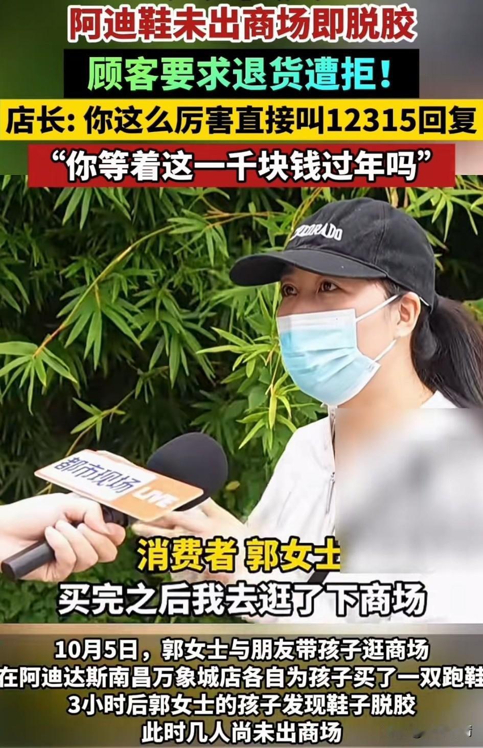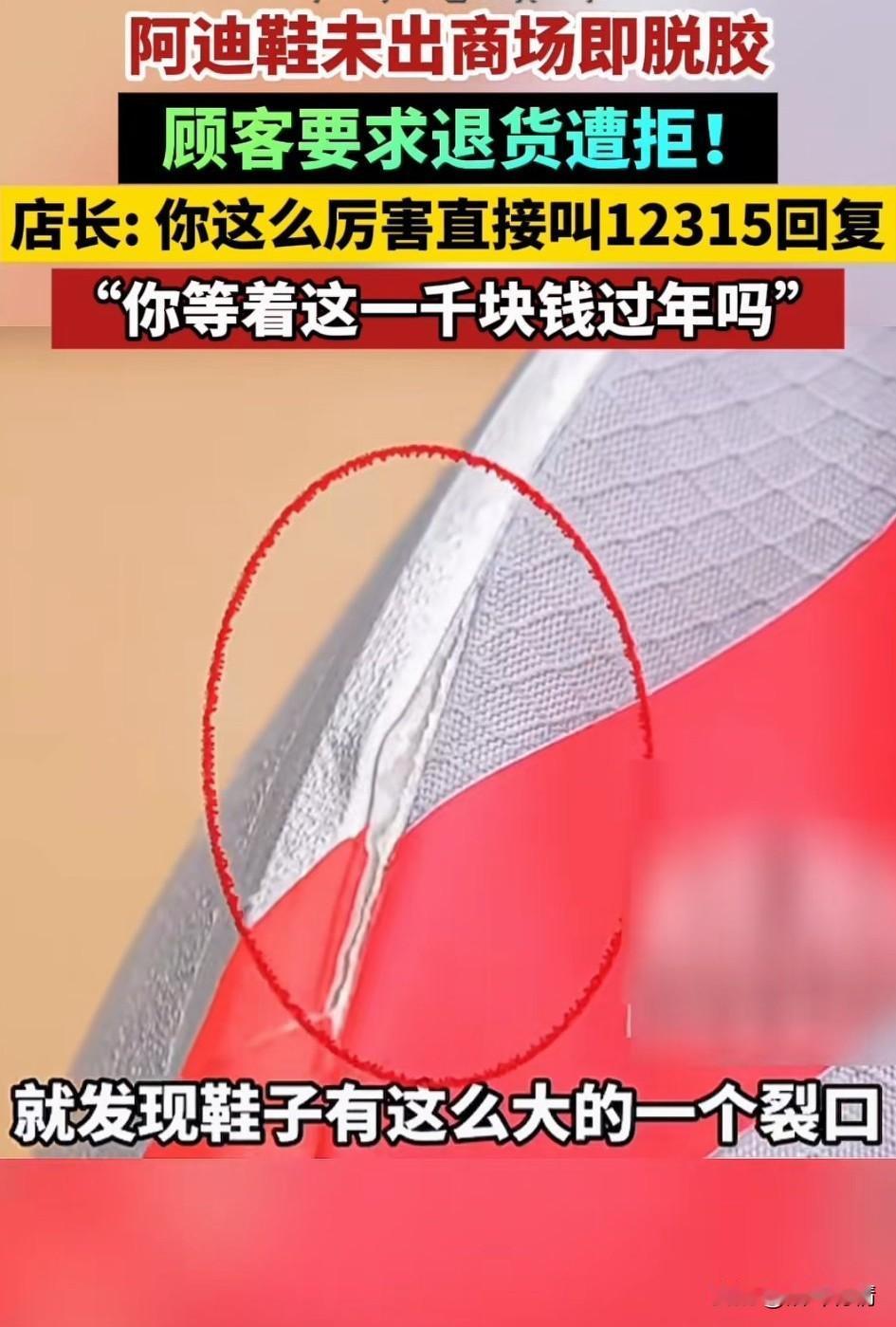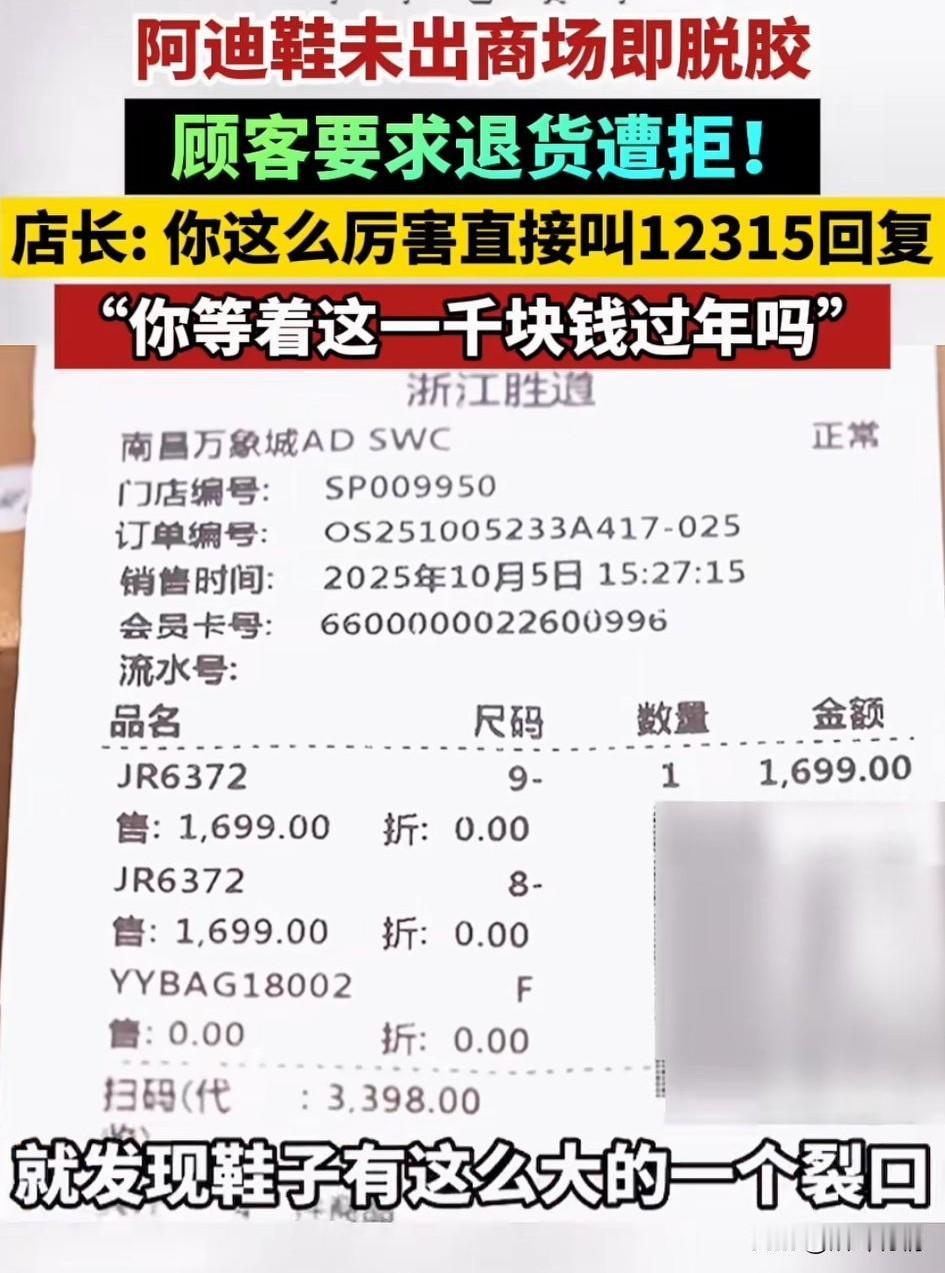 江西南昌的某迪达斯火了, 郭女士刚买的鞋子还没出商场就开裂了,想要退款却遭遇拒绝, 当时郭女士和朋友带着孩子在南昌万象城某迪达斯买了两双鞋子花费3398元, 随后就去逛街吃饭, 临走前看了一眼鞋子, 发现有一只鞋子居然脱胶了, 这可是新鞋而且不便宜, 这可是专卖店买的, 她还没出商场立刻返回, 拿着小票前往专卖店, 向工作人员说明了情况, 结果遭到工作人员拒绝退款, 才买3个小时的鞋子就脱胶了, 这肯定是鞋子质量问题, 叫来店长解决问题, 结果店长更是厉害, 直接让她拨打12315投诉吧, 退款是不可能的, 你就缺这1000块钱过年吗? 网友表示现在的专卖店都这么厉害了吗?怪不得实体店这么难, 都是不好好服务顾客, 大家对于某迪达斯专卖店卖出了脱胶鞋子还不给退款怎么看? 发现南昌遇见南昌 江西南昌身边事阿迪达斯 阿迪达斯的鞋子质量如何