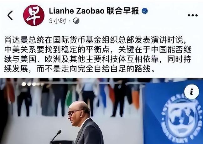 新加坡总统公开警告中国:要想世界和平,中国得放弃一样东西! 最近不少人都在说新加坡总统尚达曼在IMF总部的发言,说着说着就把矛头对准了中国,说中美要是彻底“脱钩”,世界就得分成两半,还暗示中国别老盯着“自给自足”,不然容易引发冲突。这话听着就怪:中国琢磨着自己掌握点关键技术,咋就成了引发冲突的隐患了? 咱先把话说明白,中国从来没想着啥都自己来、完全不依赖别人。现在说的“自主”,说白了都是被逼得没办法才搞的自保。你看美国,从2018年就开始跟中国搞“脱钩”,一开始是打贸易战,后来更过分,直接在芯片上卡咱们脖子;2022年还出台个芯片法案,明着说就是“对付中国”,还拉着几个盟友搞了个“芯片四方联盟”,逼着供应链里别带中国玩。 这就跟家里水管被人故意掐断了,你总得自己挖口井备着吧?中国说的“产业链自主完备”,其实就盯着芯片、高端装备这些核心环节,确保真被断供了不至于全面停摆,根本不是要关起门来自己造车。 而且尚达曼自己之前接受采访的时候还说过,美国搞的“去风险”,本质上跟“脱钩”没区别,中国最后还是能靠自己和全球市场发展起来。结果现在又把矛头对准中国的自主策略,这逻辑听着就有点拧巴。 更关键的是,到底是谁在拆全球供应链的台啊?美国一边喊着“去风险”,一边靠《通胀削减法案》搞那种只给自家和盟友补贴的政策,逼着企业把工厂搬到北美去;还弄了个“印太经济框架”,想把中国从关键产业链里踢出去,这些才是真把世界往分裂里推的事儿。连美国财长耶伦都承认,跟中国脱钩会有灾难性后果,这话可比“警告中国”实在多了。 再说新加坡自己的态度也挺有意思,他们总理黄循财刚说过,中美俩家互相靠得太近,想彻底拆开根本不现实,还警告说脱钩可能把世界推到“第三次世界大战”的边上。这说明新加坡其实门儿清,世界分裂的风险,根本不是中国搞自主造成的,而是有人非要搞“拉帮结派、分阵营”。 要是中国真听了劝放弃自主,万一哪天再被人卡芯片、卡能源,不光中国经济得受大冲击,全球供应链也得跟着崩,毕竟现在中国还是全球最能打的制造基地,大多数亚洲国家想离开中国市场做贸易,根本不现实。 其实最核心的事儿特简单:中国想要的是“能放心的合作”,不是“不管啥都靠别人”。就像家里备个急救包,不是盼着自己生病,而是怕真出点事儿的时候手忙脚乱。美国要是真担心脱钩,该做的是取消对中国的技术禁运、别再搞那些排他的小圈子,而不是逼着别人放弃自保的能力。 尚达曼担心世界分裂的心情能理解,但找错了对象,真正该被“提醒”的,是那些把供应链当武器、把全世界当棋盘耍的势力。 说到底,世界要和平,从来不是靠哪个国家放弃发展的权利换来的,得靠大家平等合作、互相尊重才行。中国从来没拒绝过全球化,一直都在扩大开放,就是别人一步步逼过来的时候,总得给自己留条后路。这道理,其实新加坡心里门儿清。