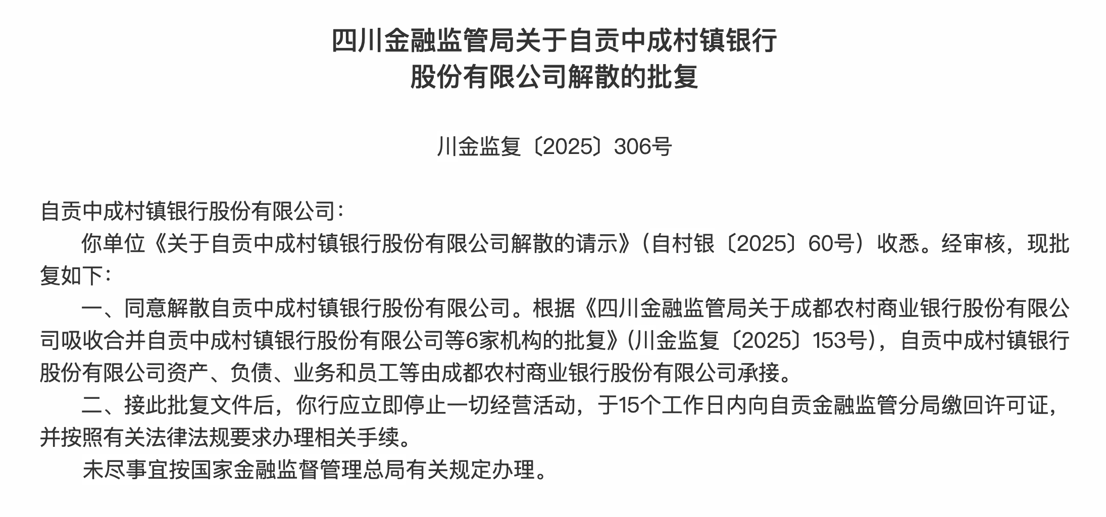 上证报中国证券网讯(章林记者徐锐)10月28日,四川金融监管局发布多条行政许可批复显示,同意解散自贡中成村镇银行、峨眉山中成村镇银行、犍为中成村镇银行、长宁中成村镇银行、南部县中成村镇银行、筠连中成村镇银行股份有限公司。根据《四川金融监管局关于成都农村商业银行股份有限公司吸收合并自贡中成村镇银行股份有限公司等6家机构的批复》,上述村镇银行资产、负债、业务和员工等由成都农村商业银行股份有限公司承接。