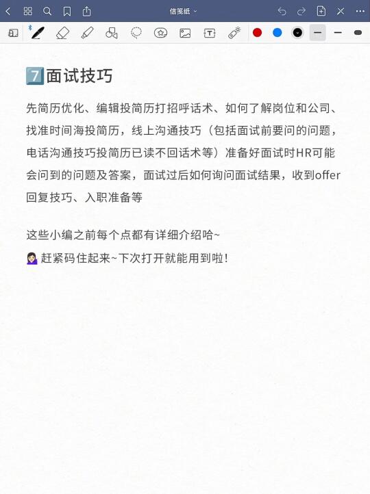 7⃣面试技巧:先简历优化、编辑投简历打招呼话术、如何了解岗位和公司、找准时间海投简历,线上沟通技巧(包括面试前要问的问题,电话沟通技巧,投简历已读不回话术等)准备好面试时HR可能会问到的问题及答案,面试过后如何询问面试结果,收到offer回复技巧、入职准备等这些小编之前每个点都有详细介绍哈~