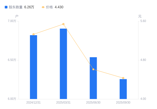 日期A股户数(户)流通A股户均持股数(股)户均持股市值(万元)2025-09-306255725304.9311.212025-06-306537224121.3511.122025-03-316904022839.8112.652024-12-316819423123.1612.322024-09-305765627349.4614.692024-06-305292229633.0515.822024-03-315137230527.1415.862023-12-314246036934.5315.082023-09-304384835765.3713.212023-06-303872933162.0213.28