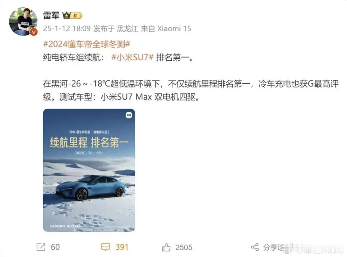 统一条件相同环境,小米就是第一啊。小米也只是拿媒体测试结果说YU7续航好,续航达成率出色。小米也没说是极寒环境吧,汽车之家叫准·冬测。后面肯定还会有媒体测零下的冬季续航,别急啊,相信成绩一定也亮眼。