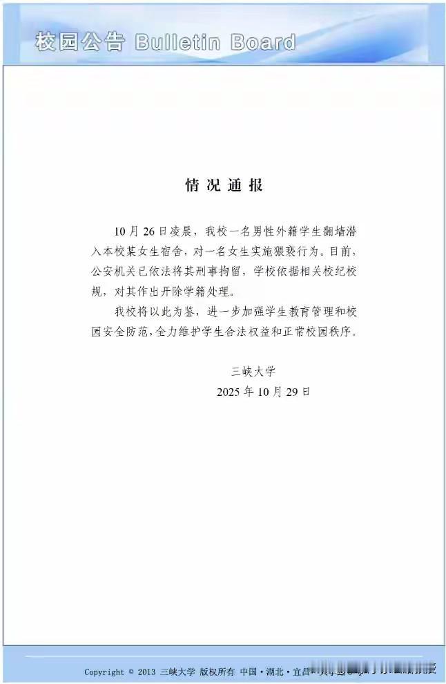 刚刚看到下图,三峡大学发的通报触目惊心!留学生怎么会干这样的事情,不过三峡大学还是给留学生留了面子,没说是哪个国家读的什么专业。 据三峡大学2025年中国政府奖学金国别项目申请指南显示,学校现有来华留学生1400余人,分别来自70余个国家。另外根据中国教育在线2017年的报道,三峡大学留学生中来自“一带一路”沿线国家印度的留学生最多。 这两年关于多地高校留学生单人宿舍比国内学生6—8人宿舍好,还免学费,有高额奖学金的争议就比较多,今天看到三峡大学还是做出了公正的处罚措施,将该学生开除学籍。 前段时间也看到不少高校在清退成绩不合格的留学生,国家给予大额补贴来中国是好好学习回去建设国家的,补贴与优待应给真正求学者,严管与公平方是国际化的正道,这才是对教育初心的坚守。