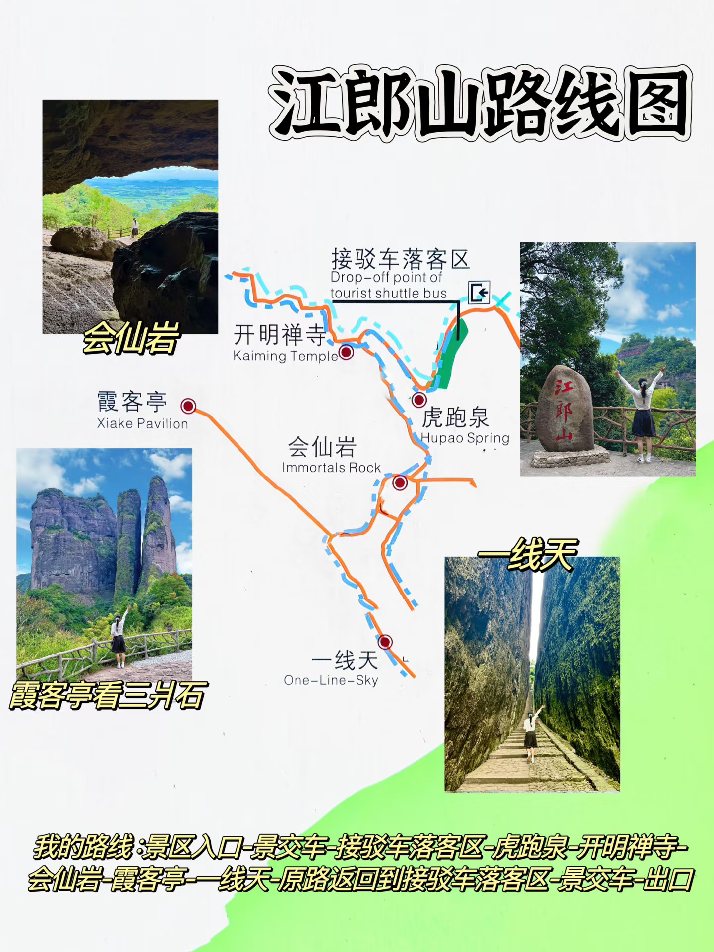 景区入口-景交车-接驳车落客区-虎跑泉-开明禅寺-会仙岩-霞客亭-一线天-原路返回到接驳车落客区-景交车-出口