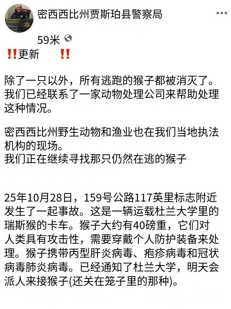疑似携带病毒的猴子在美国逃脱这不是国外xxx电影开头吗?一只携带病毒的猴子逃跑,