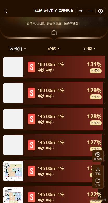 极限压缩与产品迭代: 2025年4月,澳南锦官序更是将套四三卫面积压缩到125㎡,得房率约105%。25年10月,中铁卓萃以天府新区首个公开的四代住宅,将得房率拉升至约130%。