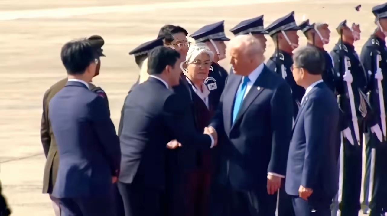 考虑到美总统已是八旬高龄,从舷梯走下时步伐较为缓慢,全程手扶舷梯边缘,小心翼翼地迈步。除此之外,韩方准备的红毯也被指“略显敷衍”,长度仅约十多米。从现场画面来看,红毯两侧站立的接机人员单侧约二十人,两侧人员总数甚至难以确定是否能达到五十人,整体接待规模与外界预期存在差距,也让不少人质疑韩方此次接待的诚意。