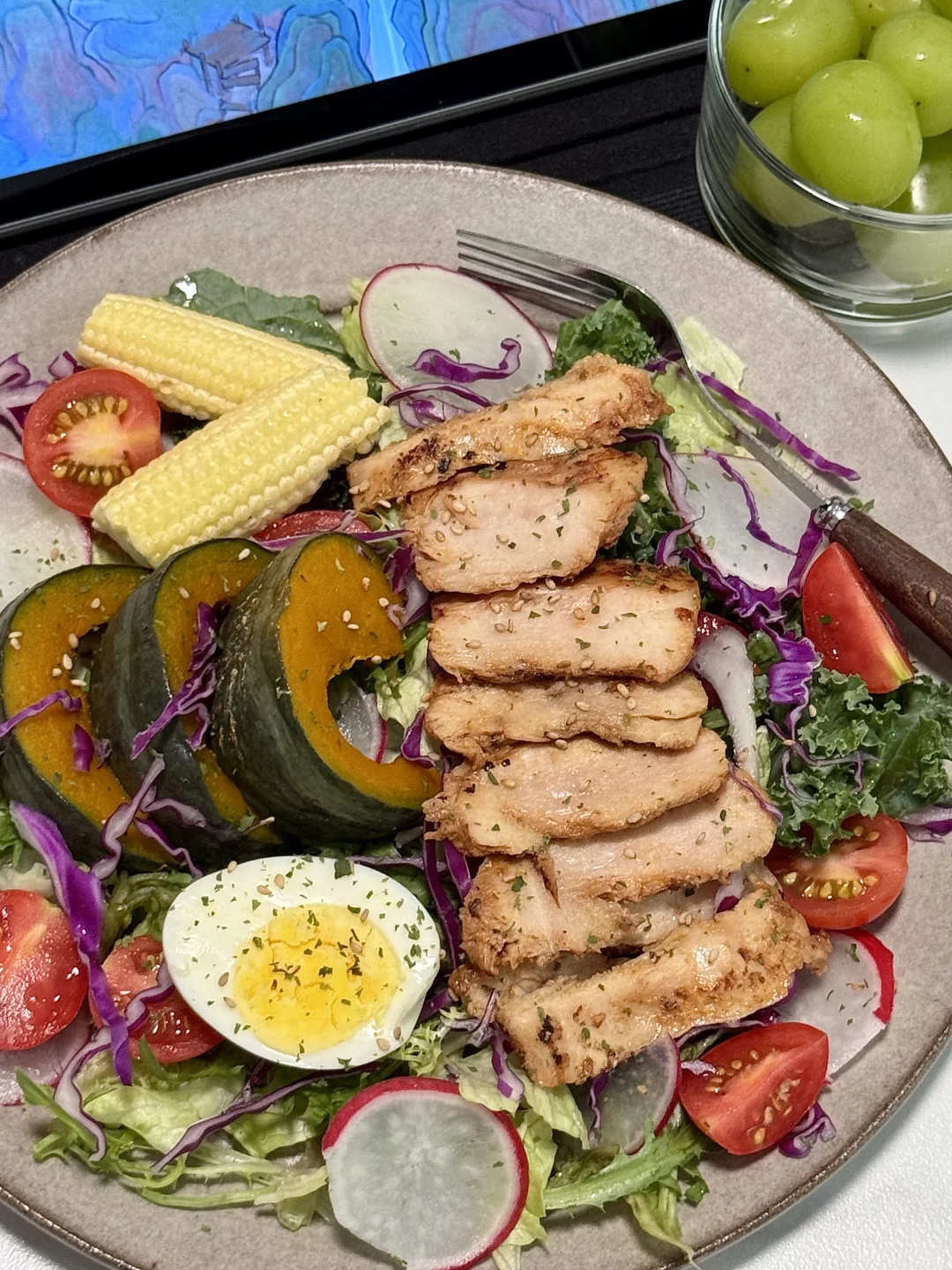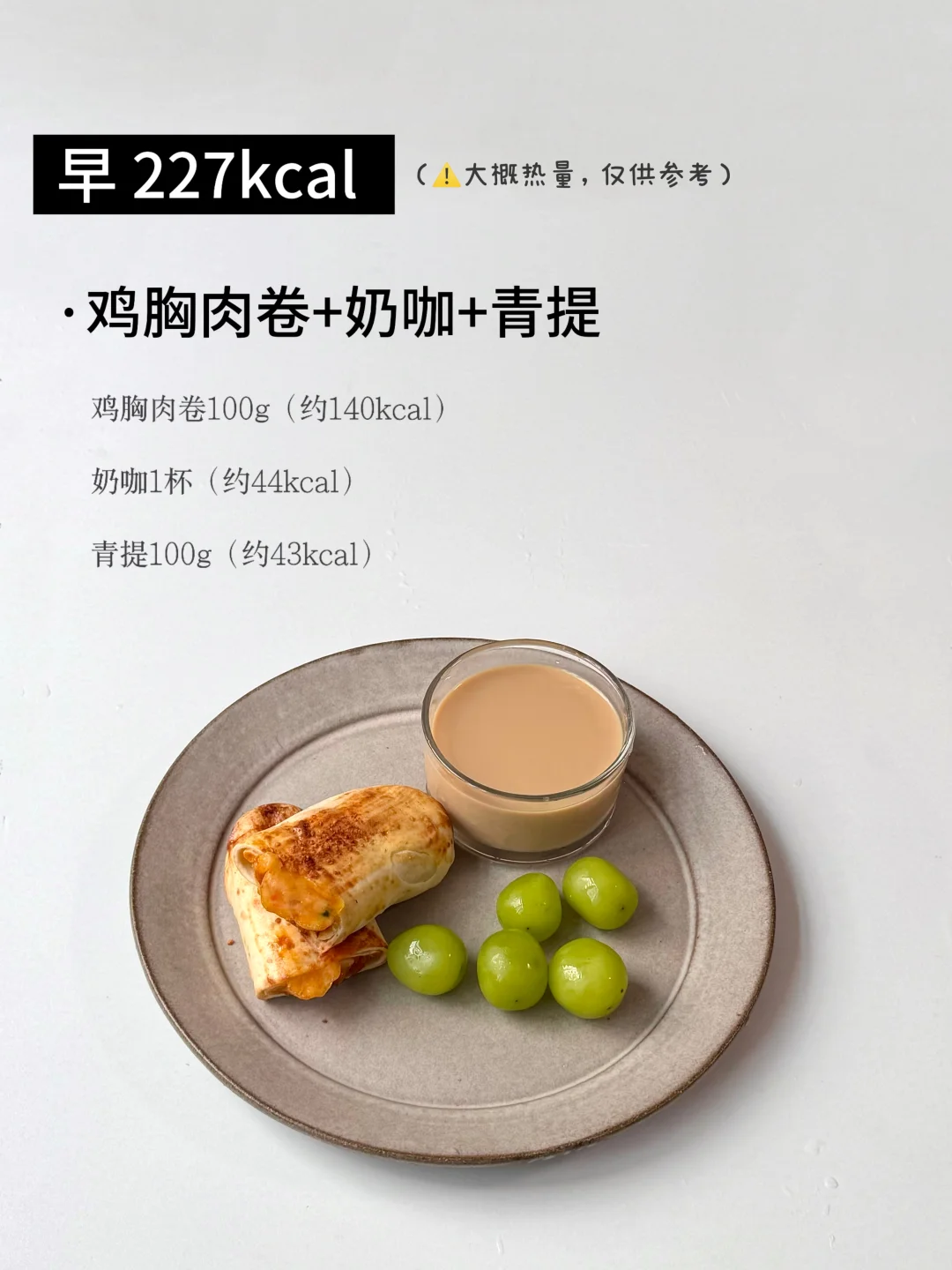 减脂饮食记录|一天853kcal,好吃还掉秤! • 早:鸡胸肉卷+奶咖+青提(227kcal) • 午:鸡胸肉蔬菜沙拉(432kcal) • 晚:牛肉拌黄瓜(194kcal) 减脂期这样吃,饱还低卡,冲!