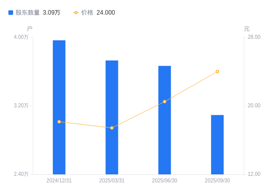 日期A股户数(户)流通A股户均持股数(股)户均持股市值(万元)2025-09-303092113832.0933.202025-06-303666711664.5023.902025-03-313728811387.0019.842024-12-313964010711.3619.432024-09-30659836434.9712.382024-06-30523938104.1110.382024-03-314113210242.2312.952023-12-314142910168.8113.852023-09-30437679625.6012.652023-06-30478528803.8914.30
