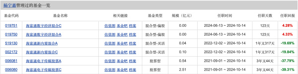 更具讽刺意味的是2024年6月接手的海富通数字经济混合基金,杨宁嘉仅管理100多天便仓促卸任,而这只基金成立于2024年6月13日,成立不足一年,就在2025年5月宣告清盘。