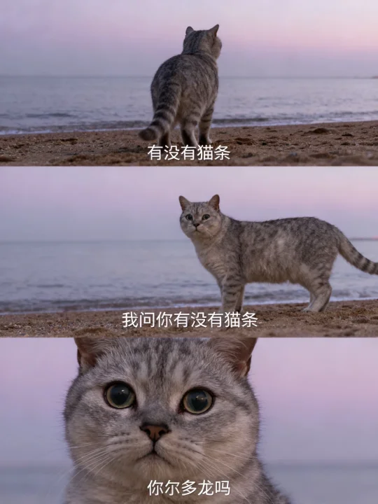 2️⃣ 帮我生成图片:将图片编辑为三宫格艺术感宠物海边写真图,保持原比例。第一张近景:宠物背影站在沙滩上,天空淡紫与灰色渐变,海面平静,添加中文字幕“有没有猫条”;第二张侧身:宠物站立于海边看向镜头,背景同前,n添加中文字幕“我问你有没有猫条“;第三张特写:宠物脸部特写,背景同前,添加中文字幕“你尔多龙吗” 。整体色调清冷,文艺且充满自我探索情绪,三张图合成一个三宫格。原比例。