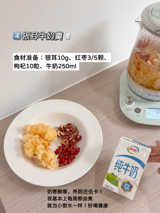 食材准备:银耳10g、红枣3/5颗、枸杞10粒、牛奶250ml