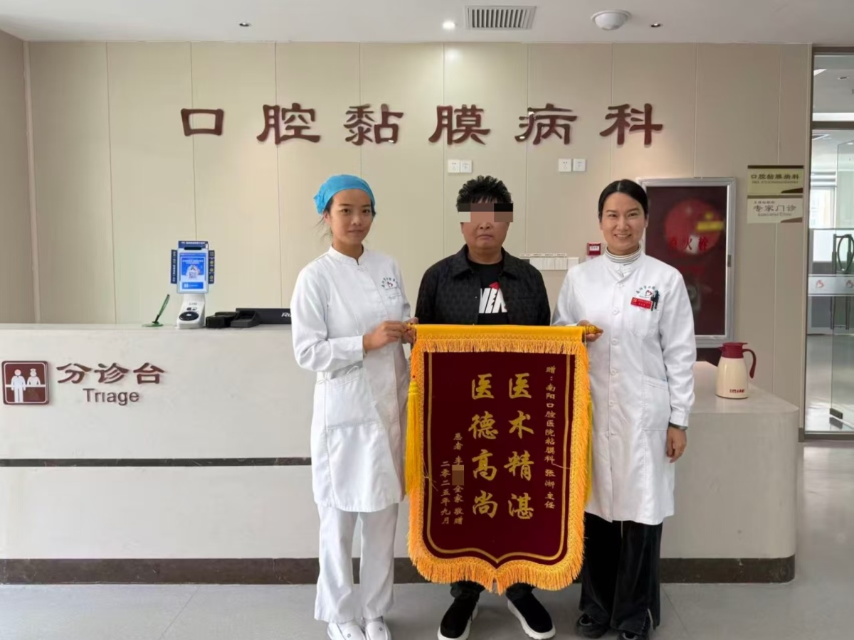 2025年10月23日,南阳市口腔医院内上演了温馨一幕。患者李先生将一面承载着真挚谢意的锦旗,送到口腔黏膜病科张淅主任手中,感谢其精心治疗与关怀。