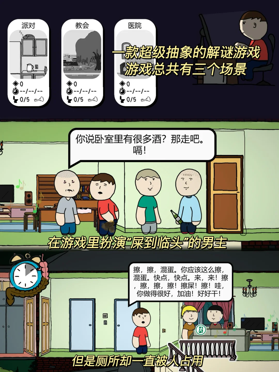 游戏名:《Code Brown》 平台: Steam 游戏简介🎮: - 在各种公共场合急需上厕所的时候 却发现厕所都被占着 这个时候却有着一锅刚煮好的汤 要不然就… 游戏优缺点🎨: - ✔️极端抽象的搞笑解谜游戏 ✔充满自由的简笔画风 ✔有三个可以爽玩的大场景 ✔️有可以解锁的隐藏剧情 ❌不适合吃饭的时候玩 游戏评价📝: - 大名鼎鼎的社恐模拟器,你扮演的是个小有名气的知名博主,为了维持自己的名声,如何体面的到处拉💩就成了一个急需解决的难题,每次被发现的时候,透过屏幕都能感受到主角的绝望…