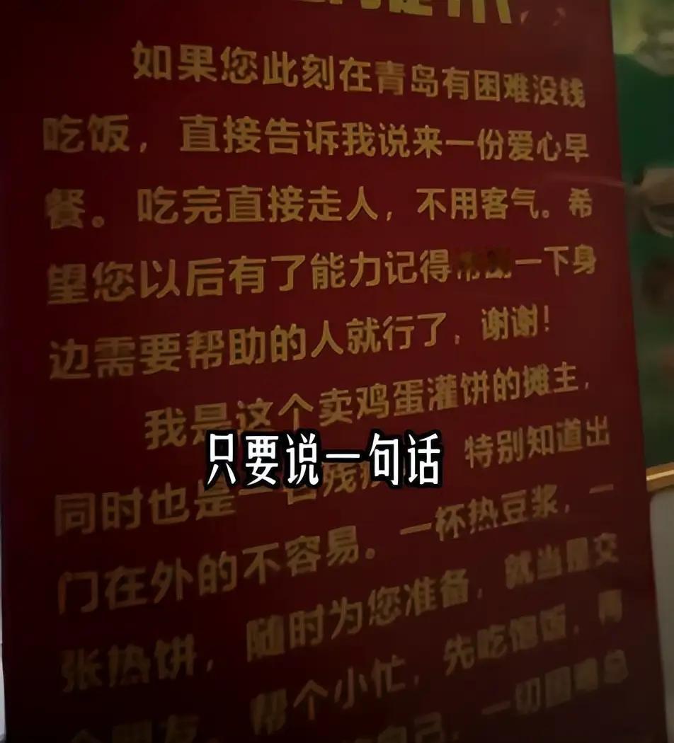 “太感人了!”山东青岛,一残疾大叔凌晨四点带着儿子在工地旁摆摊,并推出免费“爱心早餐”,有困难的人只需说一句就能领取,博主亲身体验后确认真实,视频曝光后网友直呼看哭了。 据抖音个人账号2025年10月25日消息,10月22日凌晨四点,博主在青岛一工地旁发现餐车挂着“爱心早餐”横幅,摊主是一名行动不便的大叔,身旁还跟着穿校服的儿子,两人正忙碌着准备餐食。 博主好奇上前询问,摊主热情回应,并主动提供免费热饼和豆浆,还贴心地多给了一张饼,担心博主吃不饱,孩子在旁乖巧地帮忙,让博主先找地方坐等。 没想到,博主后续交谈中得知,摊主腿脚不便竟是天生残疾,妻子更在两年多前因乳腺癌去世,且是一名聋哑人,夫妻俩曾一起经营面馆多年,没少受他人嘲笑,但始终不离不弃。 更让人心疼的是,孩子每天凌晨帮忙摆摊,放学后还继续协助,手上冻出口子也不喊累,当被问及为什么哭时,孩子哽咽说怕爸爸年纪大离开自己,父子俩当场相拥而泣,彼此都是对方最重要的人。 原来,摊主过去开面馆时,就以孩子名字命名并嵌入“爱心”二字,每卖一碗面就捐1元给残疾学校,他引用某明星的话说:“光不一定永远照在我身上,但自己要努力成为一束光。” 这份善意因曾被他人温暖过,所以选择继续传递,简单一句“有需要”,就能在困境中获得热饼和豆浆,父子俩用乐观和坚持,在苦难中拼出一片天地。 对于这件事情,大家有什么看法?