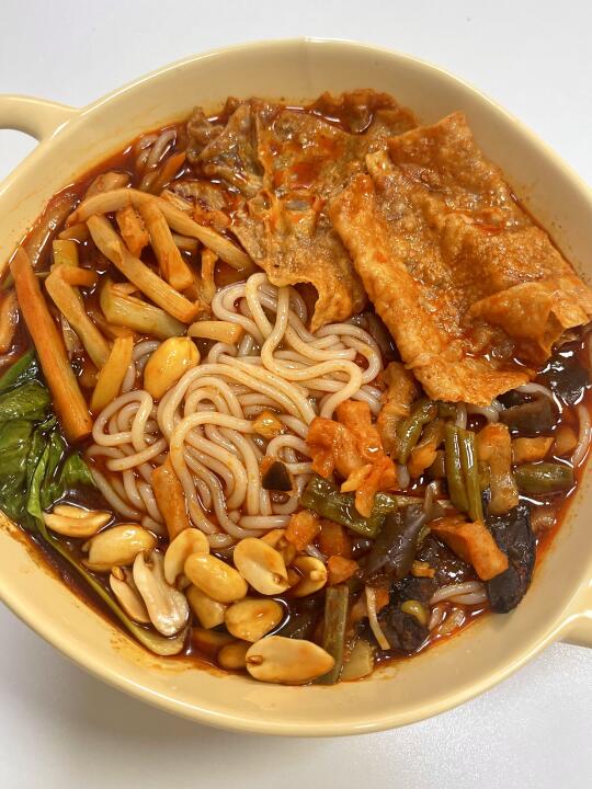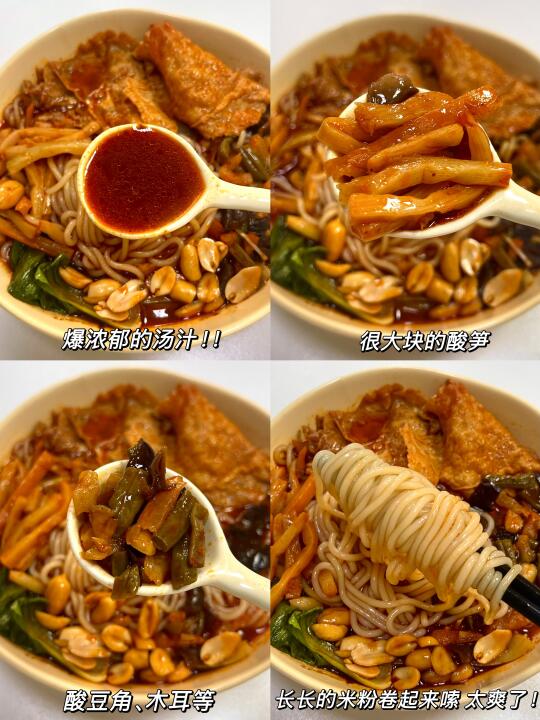 配料也超多 酸笋、木耳、酸豆角、花生…爽脆可口,很大块的配菜配长长的米粉,闻起来超臭 入口又巨香!小料包里的红油超辣,根据自己口味放哦!