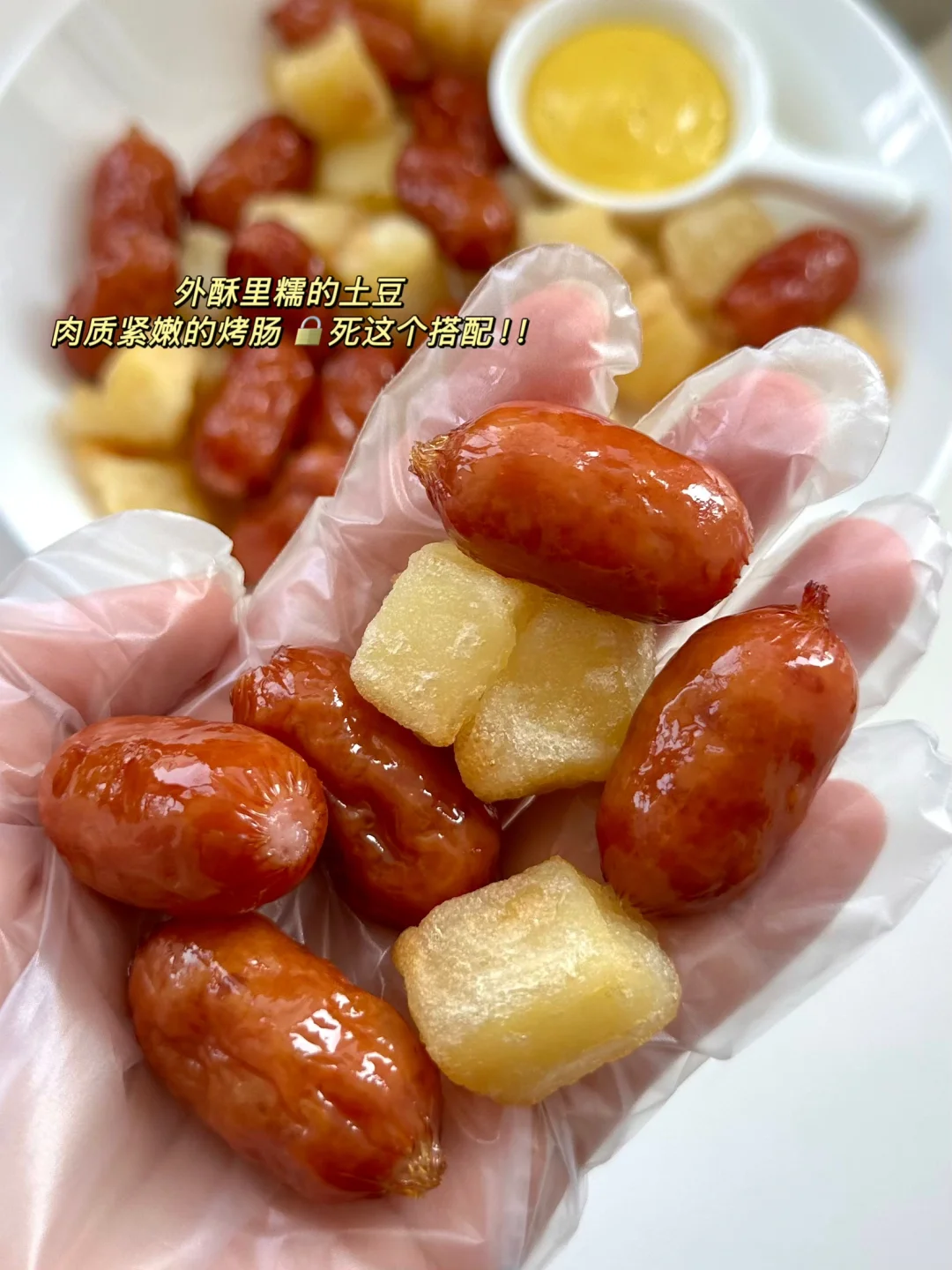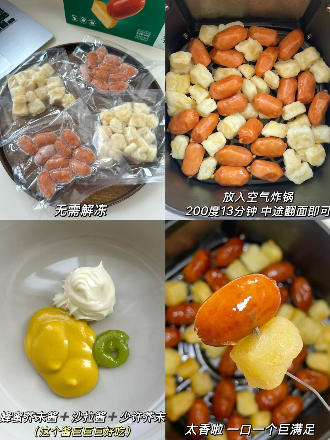 土豆和香肠的神仙搭配有人懂吗! 这个香肠薯薯乐简直满足我的双重需求😭 香肠肉质超紧实 超级爆汁 扎实有嚼劲! 原切的土豆外酥里糯 很绵密的口感 一口一个超好吃😋 夜里饿了就直接给自己炸上一锅 不用提前解冻 直接丢进空气炸锅十分钟就搞定 巨巨巨方便!我这种懒人简直爱惨了!