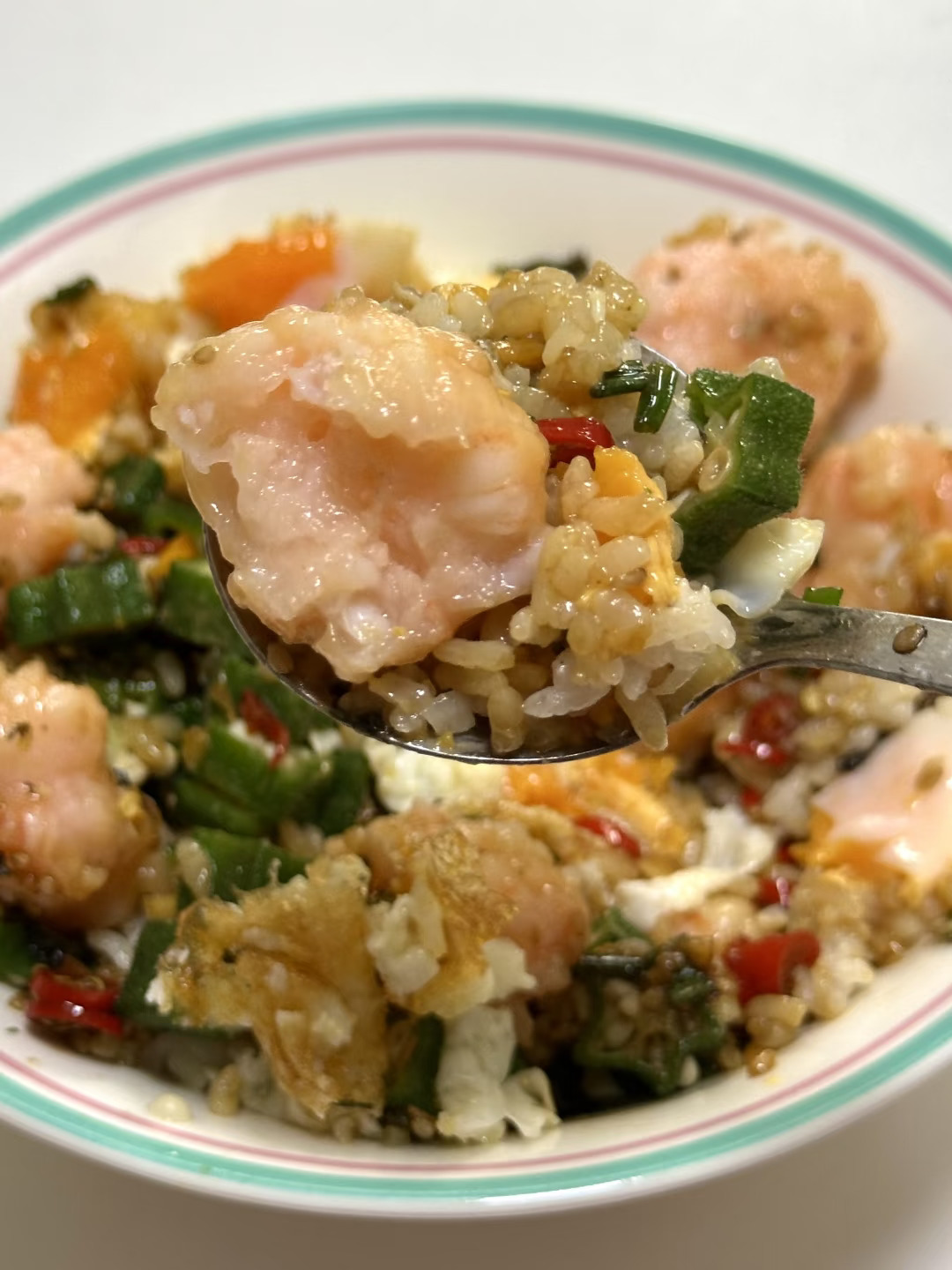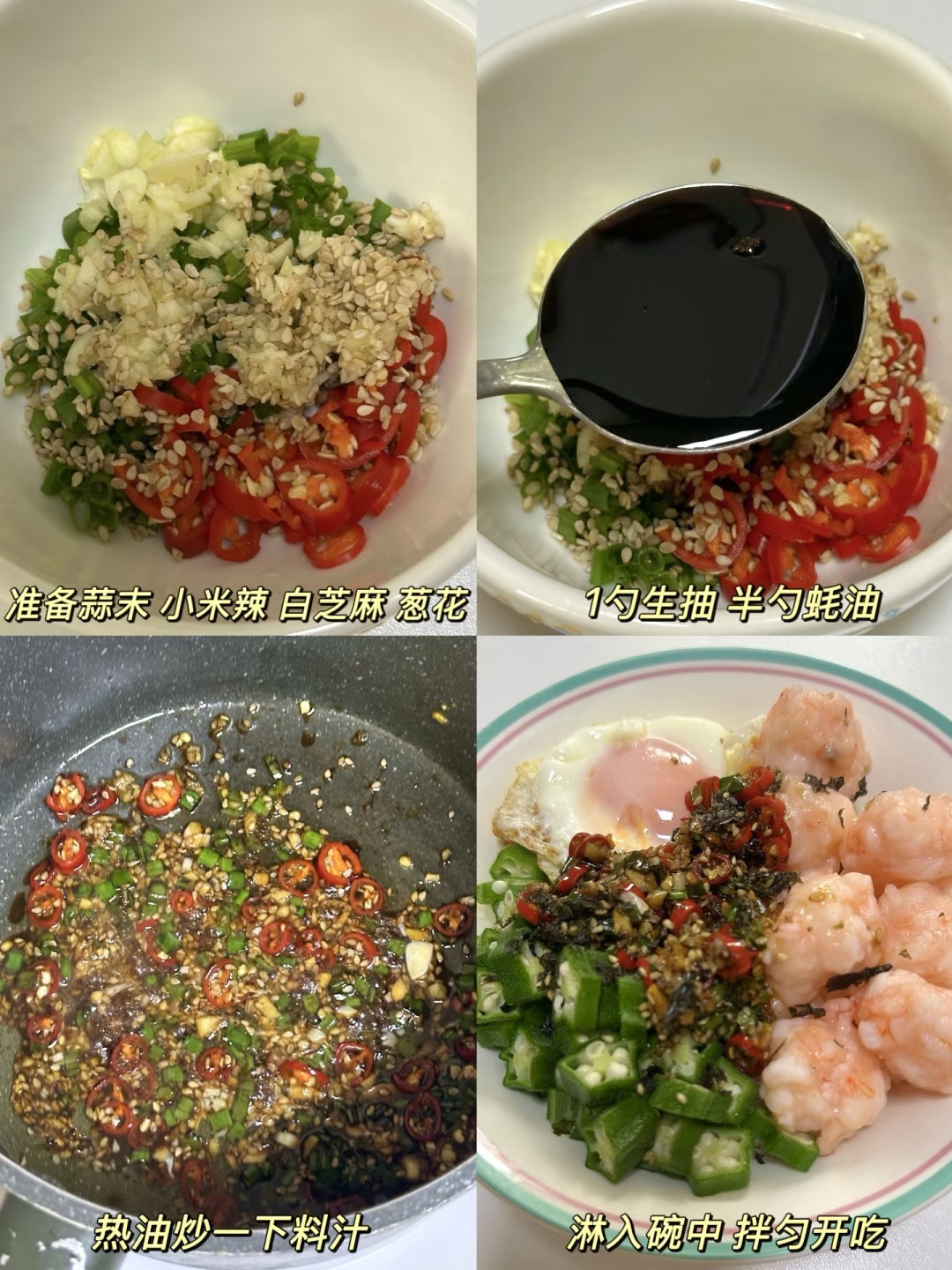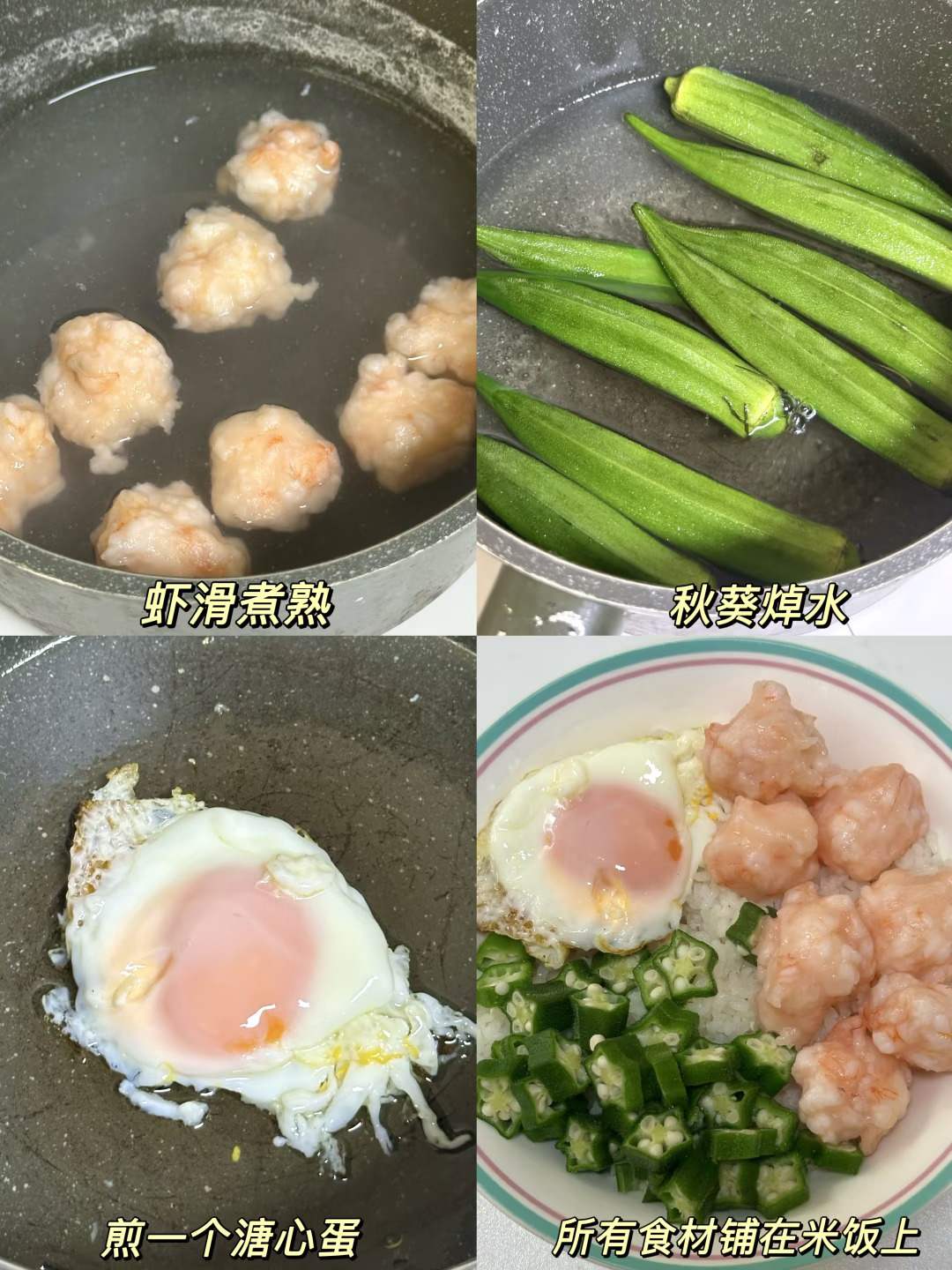 这也太太太好吃了叭!! 鲜嫩Q弹的虾滑 搭配着黏糊的秋葵 再加上外焦里嫩的溏心蛋…太满足啦! 蛋白质?碳水?蔬菜都有了!简直完美~ 食材:虾滑 秋葵 鸡蛋 米饭 料汁:蒜末 小米辣 葱花 白芝麻 1勺生抽 半勺蚝油 最后还可以加点海苔碎哦 超香的!!