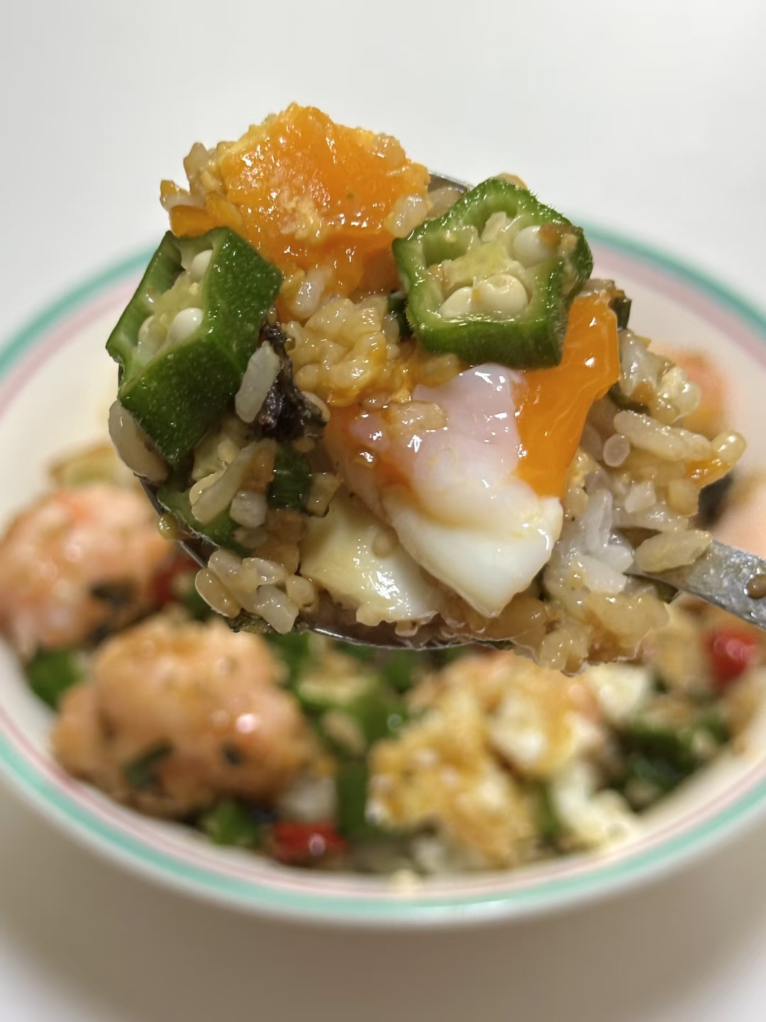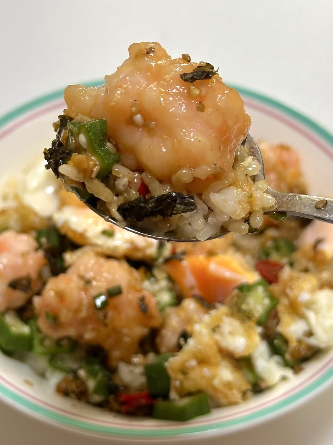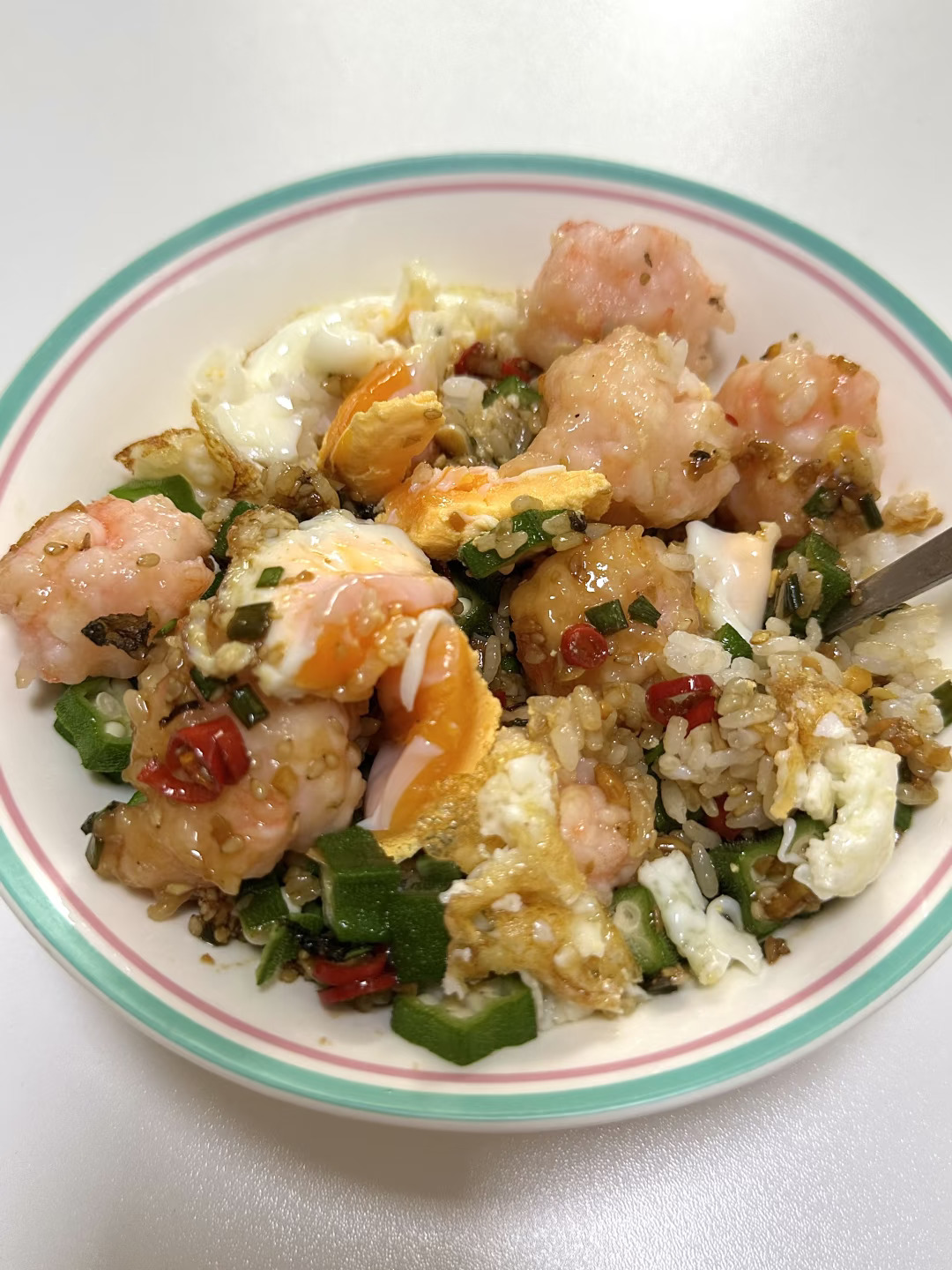 这也太太太好吃了叭!! 鲜嫩Q弹的虾滑 搭配着黏糊的秋葵 再加上外焦里嫩的溏心蛋…太满足啦! 蛋白质?碳水?蔬菜都有了!简直完美~ 食材:虾滑 秋葵 鸡蛋 米饭 料汁:蒜末 小米辣 葱花 白芝麻 1勺生抽 半勺蚝油 最后还可以加点海苔碎哦 超香的!!