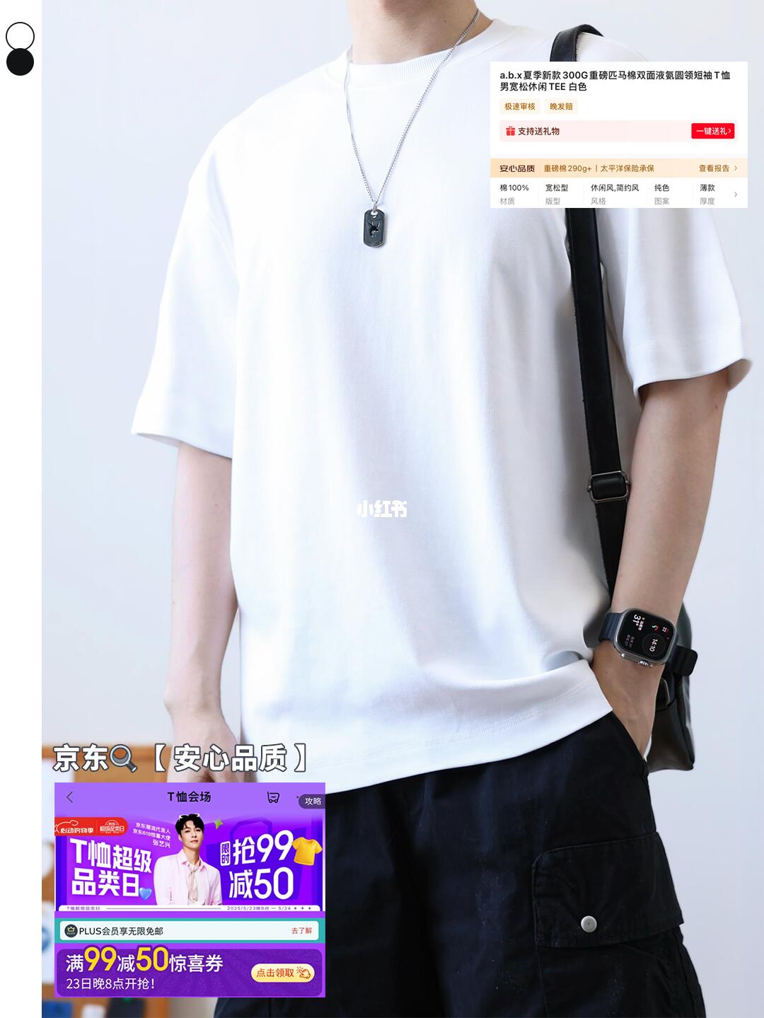 像这件300g的重磅T恤,不挑风格,不挑场合,每个男生衣柜都该有它的一席之地!最重要的是它的材质是100%纯棉非常的舒服,男孩子夏天买T恤比较发愁的几个问题,凸点尴尬,软榻,洗洗就黄,显得廉价,那要怎么选到不凸不塌的T恤,推荐克重260g+就能做到挺阔,并且织数60支以上,面料更加柔软丝滑,实在不懂的,记住这个公式,对照了商品介绍的参数看一下260g+纯棉+60支=不凸不塌;本期白色T恤是在京东入手的,现在618活动期间,大牌T恤低至5折,面料、功能等都在安心品质卡上标得清清楚楚,再也不怕挑不对T恤,上京东搜索【安心品质】进入会场get同款吧!希望本期搭配指南可以帮到你,下期见!