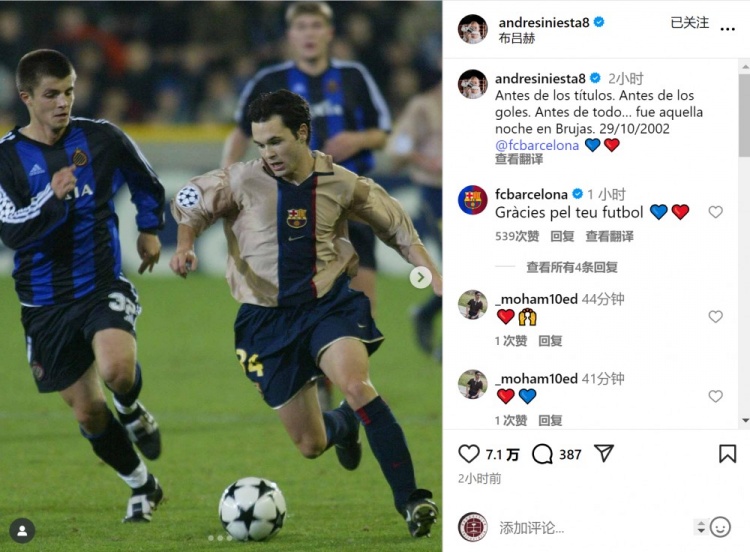 伊涅斯塔社媒晒出首秀的照片,配文:“在奖杯、进球乃至一切之前,故事始于布鲁日的那个夜晚,2002年10月29日。”