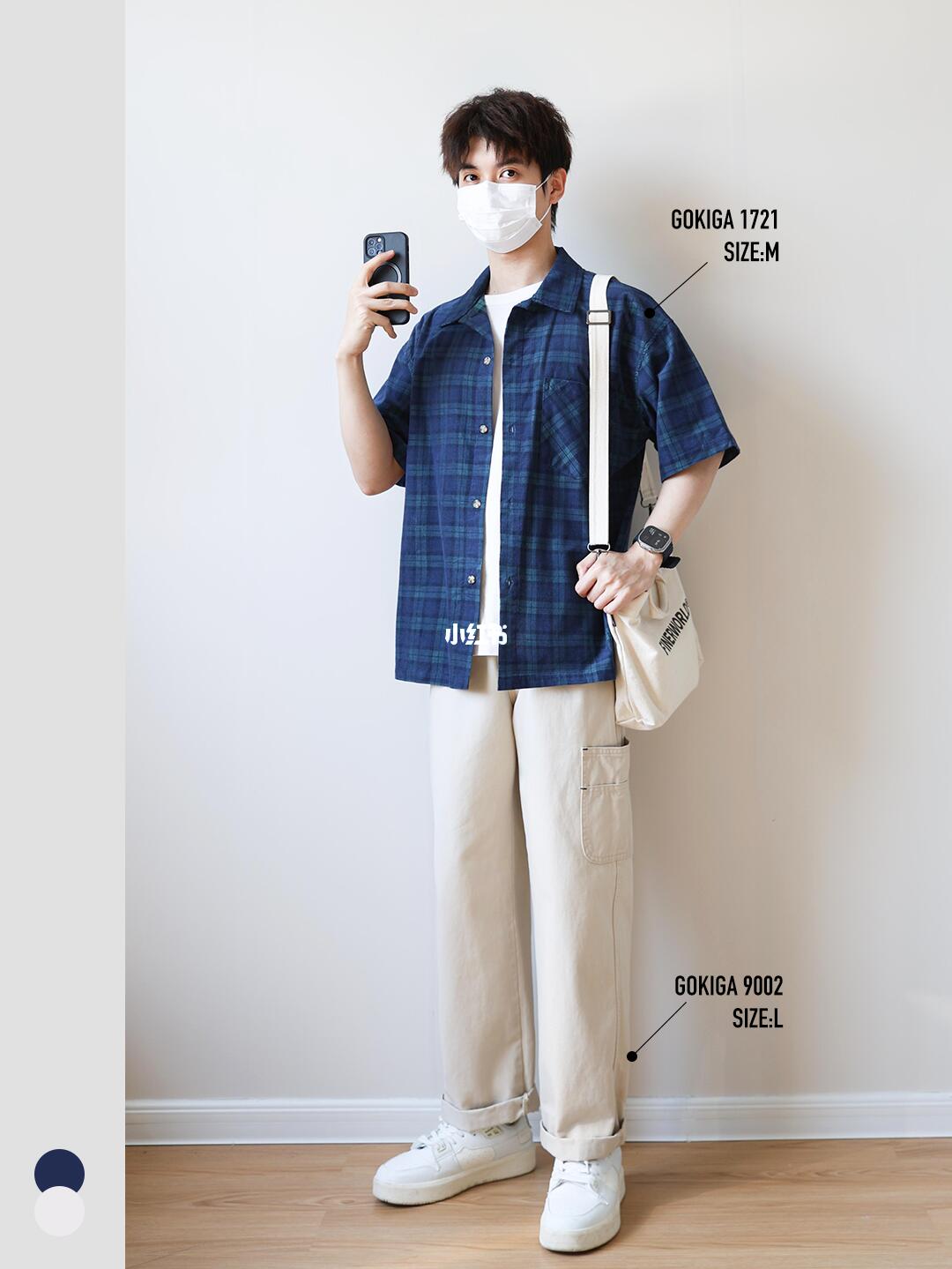 周一:蓝色格子衬衫 + 米白工装裤:干练又不失温柔!