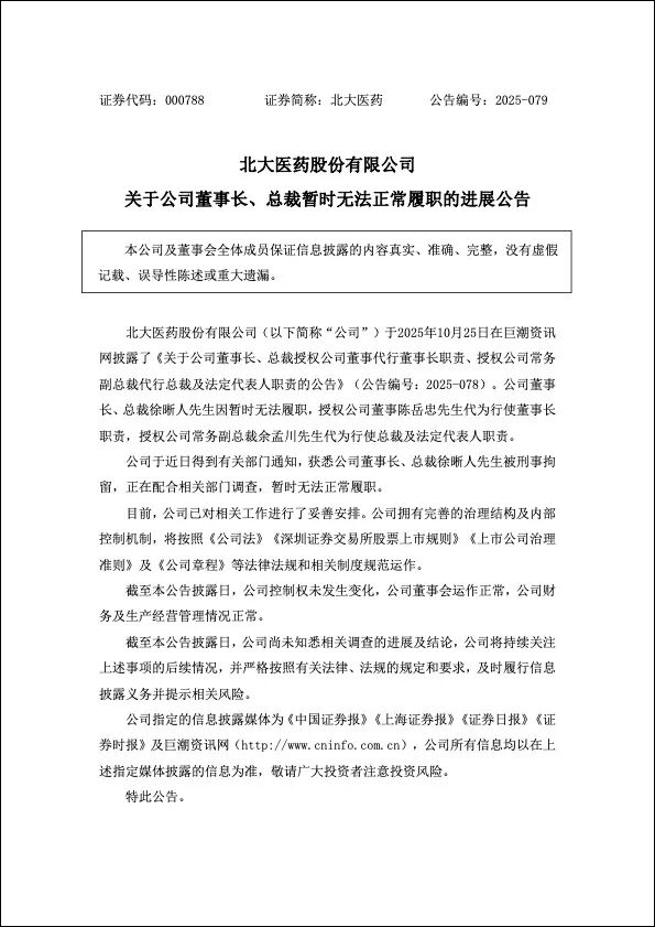 10月29日,北大医药股份有限公司发布公告称,公司于近日得到有关部门通知,获悉公司董事长、总裁徐晰人被刑事拘留,正在配合相关部门调查,暂时无法正常履职。