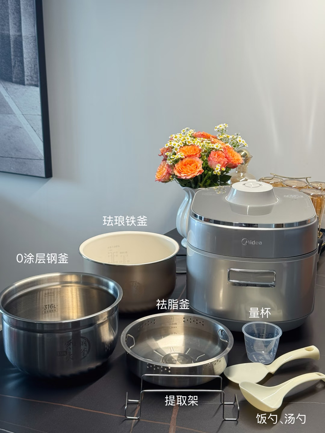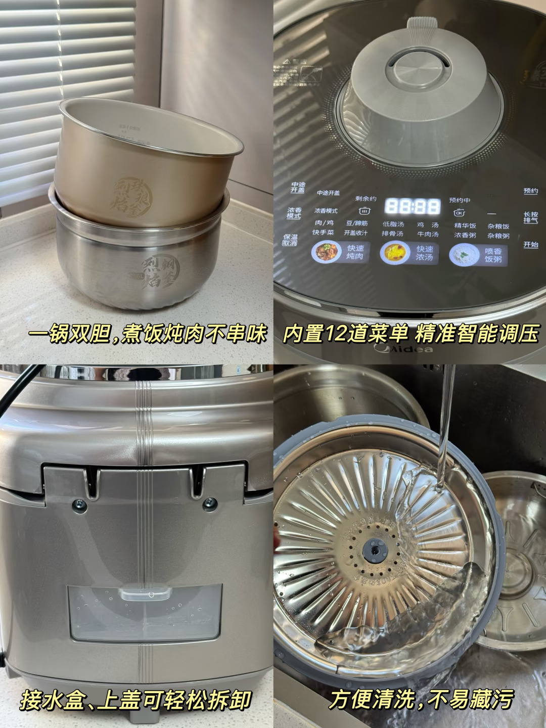 它的祛脂釜堪称“油脂分离器”。在烹饪过程中,当锅内汤汁沸腾翻滚,油脂会随着汤汁被冲进祛脂釜 。祛脂釜利用水油密度不同的物理特性,就像一个精密的滤网,四周均匀分布的66个小孔,能将油脂拦截在釜内 ,仅让营养汤汁回流到内胆中。能有效祛除汤汁中的油脂 ,使喝到的每一口汤都清爽鲜香没负担。浮油还可以留着下面条~自带的两个内胆, 0氟0涂层钢釜内胆,免去了担心涂层脱落的烦恼而且清洗起来还特别方便,实用又省心,5L大容量加内置12道菜单精准智能调压能满足我们一家人的日常所需,家里有想入压力锅的宝子们,推荐这款闭眼入!