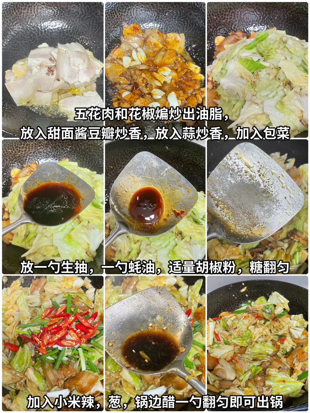4⃣️再放入一些油,将五花肉和花椒煸炒出油脂,放入甜面酱和豆瓣酱炒香,再加入蒜瓣炒香,放入包菜。调味,加入1勺生抽,1勺蚝油,适量的胡椒粉和糖,翻炒均匀,再加入小米辣和葱段,从锅边来一点醋。翻匀即可出锅,这样做出来的五花肉炒莲白真的巨好吃,喜欢的姐妹试一试吧。