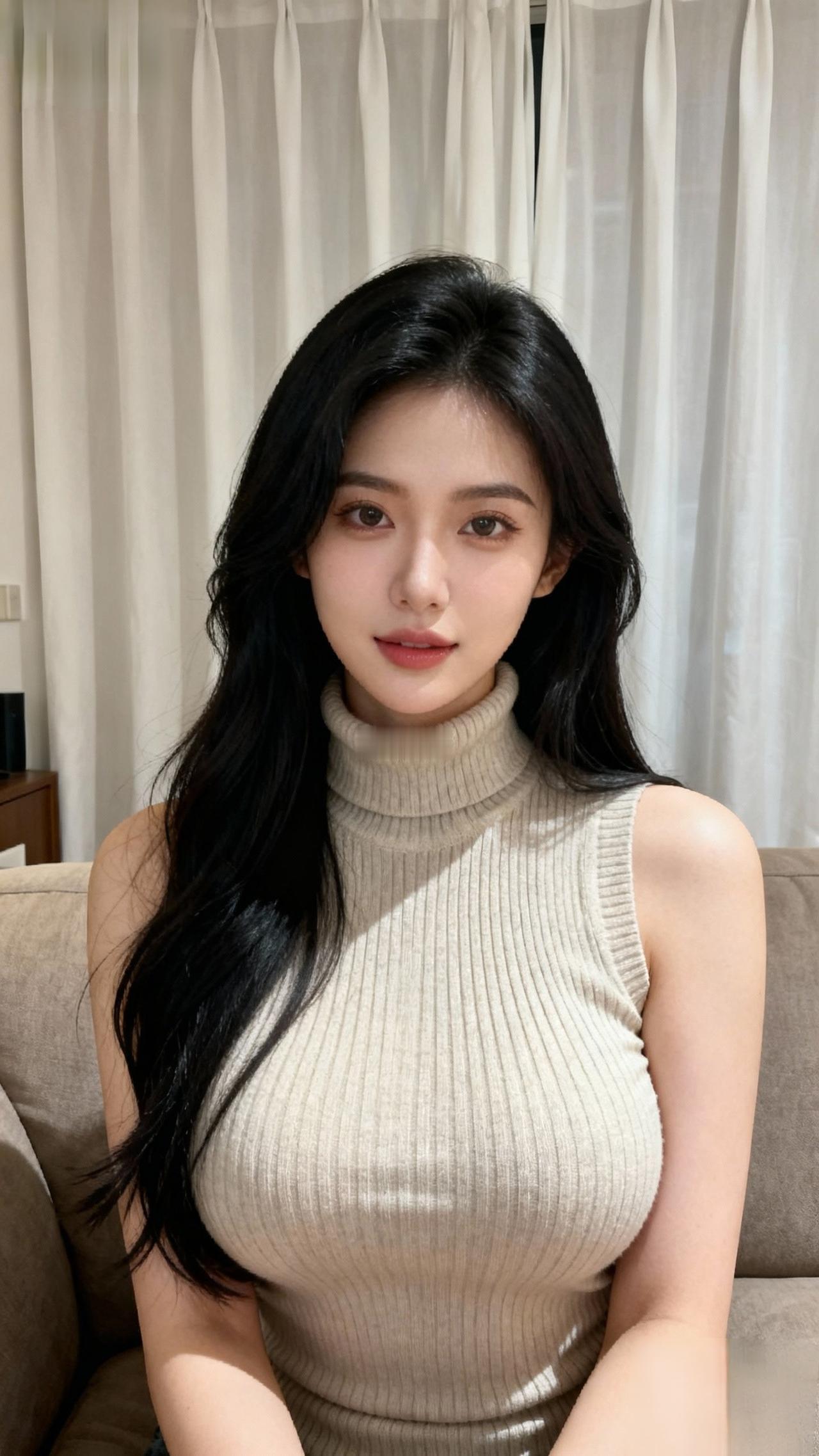 温柔甜美的少女,米色高领毛衣,优雅气质,居家自拍居家
