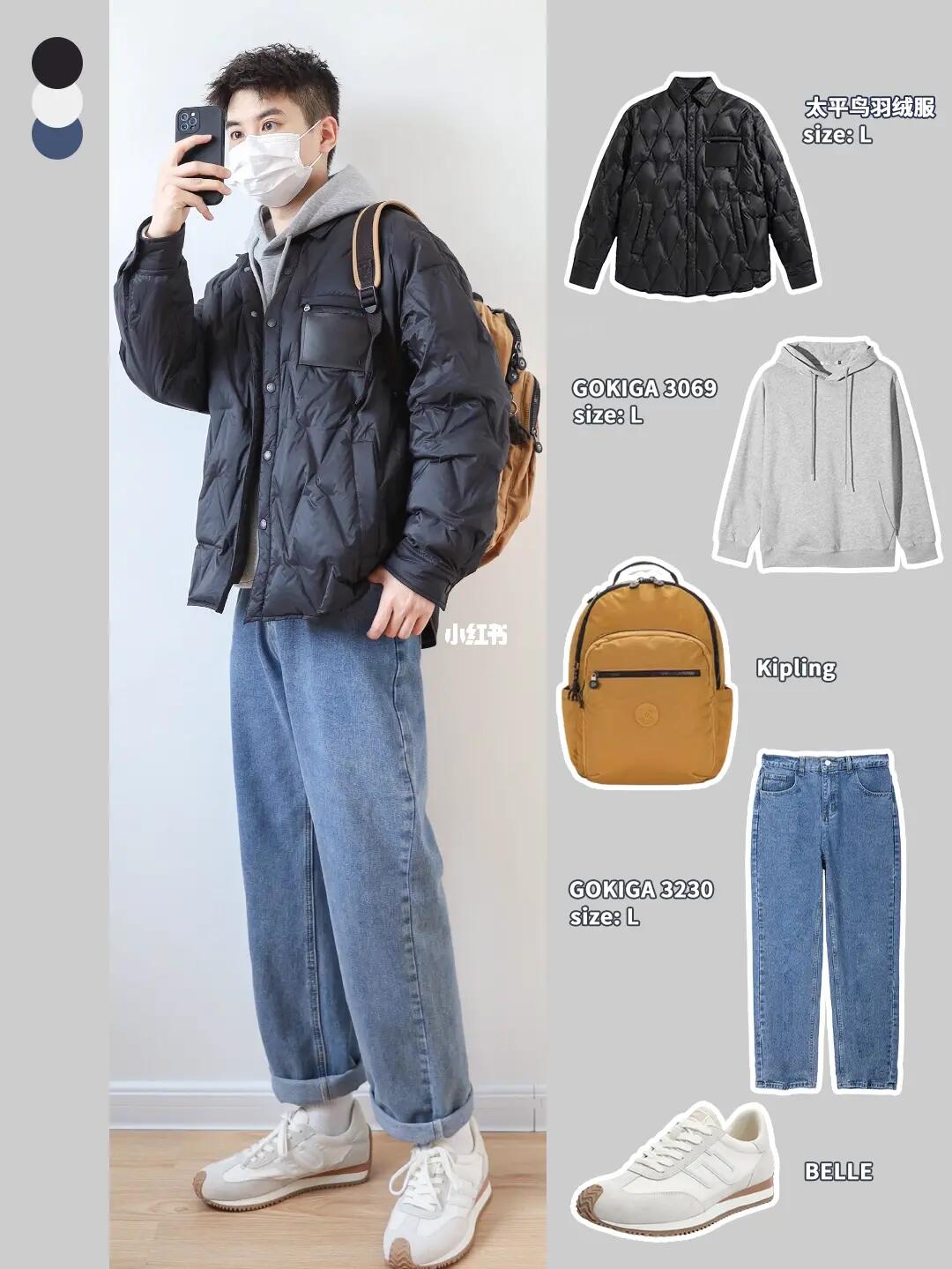 黑色羽绒服+灰色连帽卫衣+蓝色牛仔裤