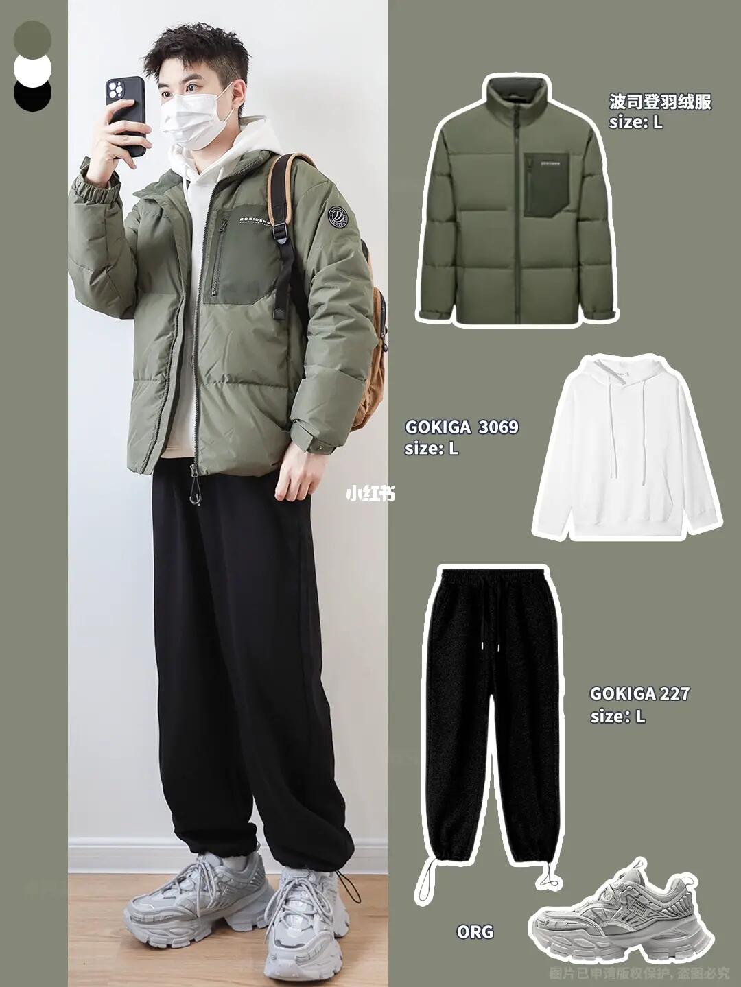 绿色羽绒服+白色连帽卫衣+黑色运动裤