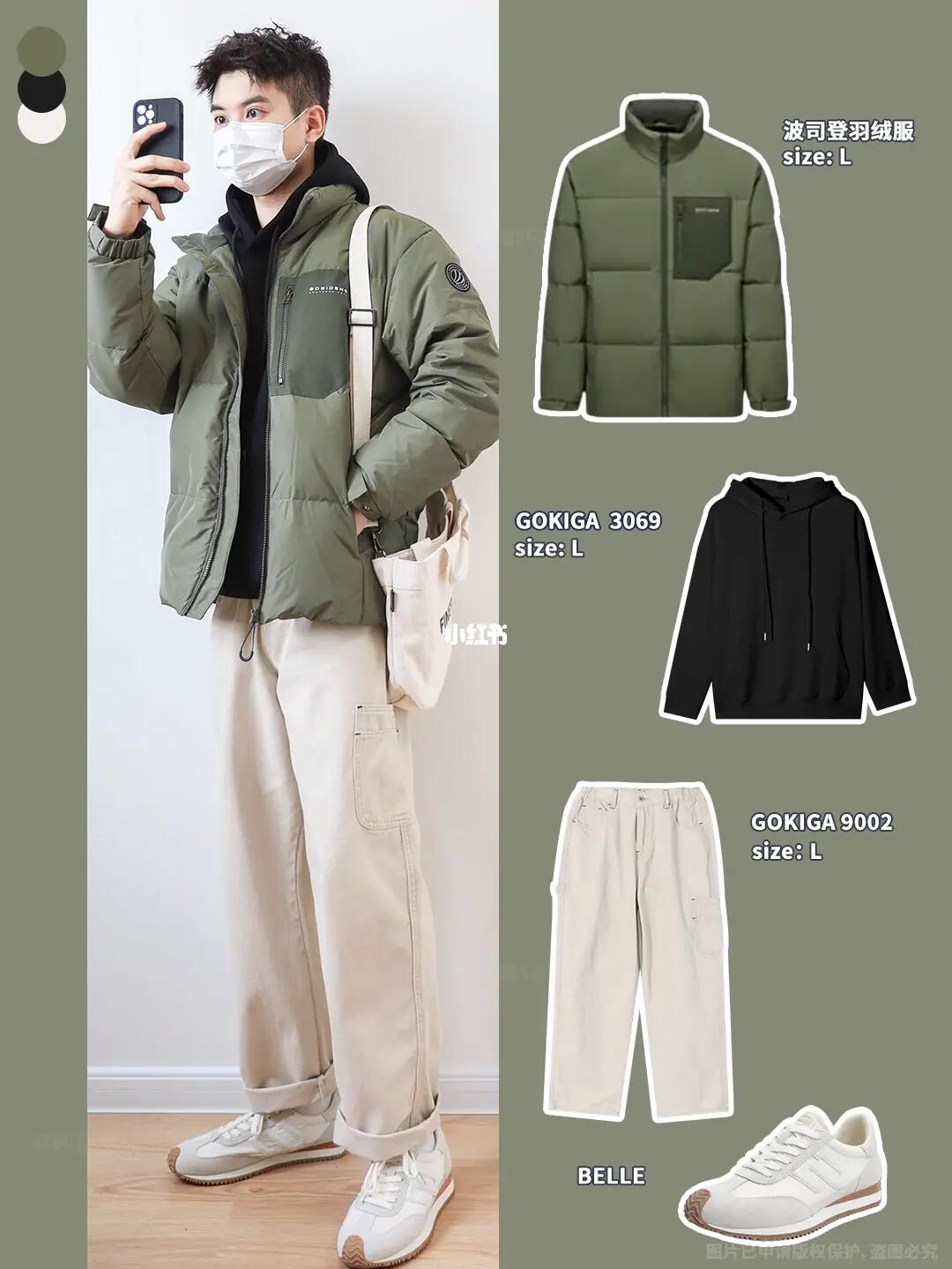 绿色羽绒服+黑色连帽卫衣+米白工装裤
