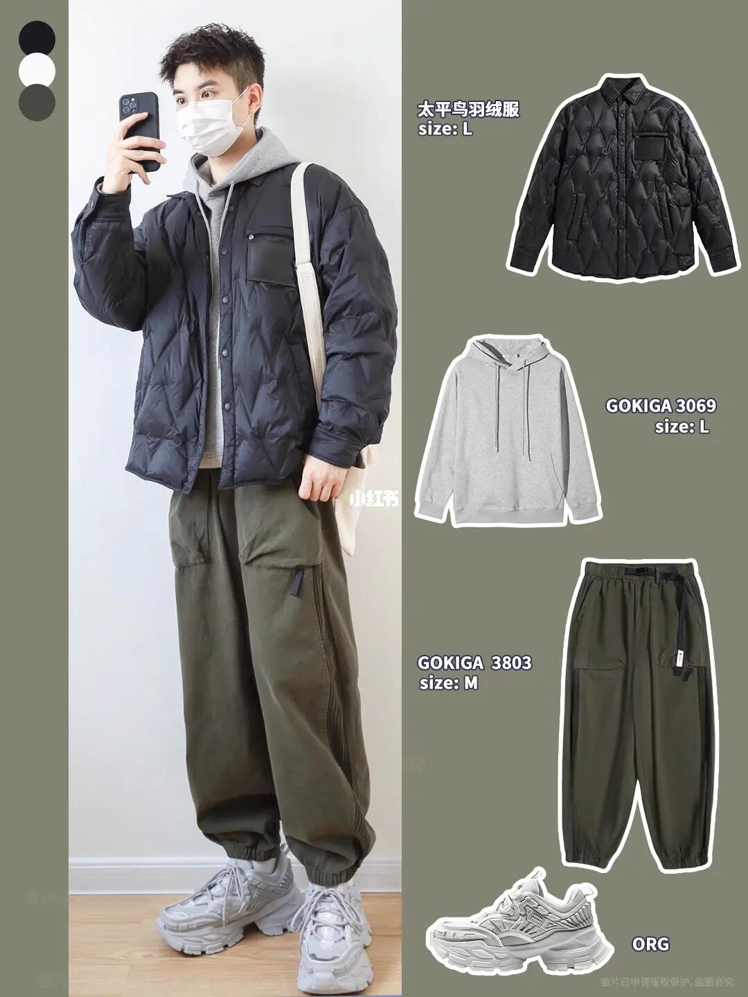 黑色羽绒服+灰色连帽卫衣+绿色工装裤